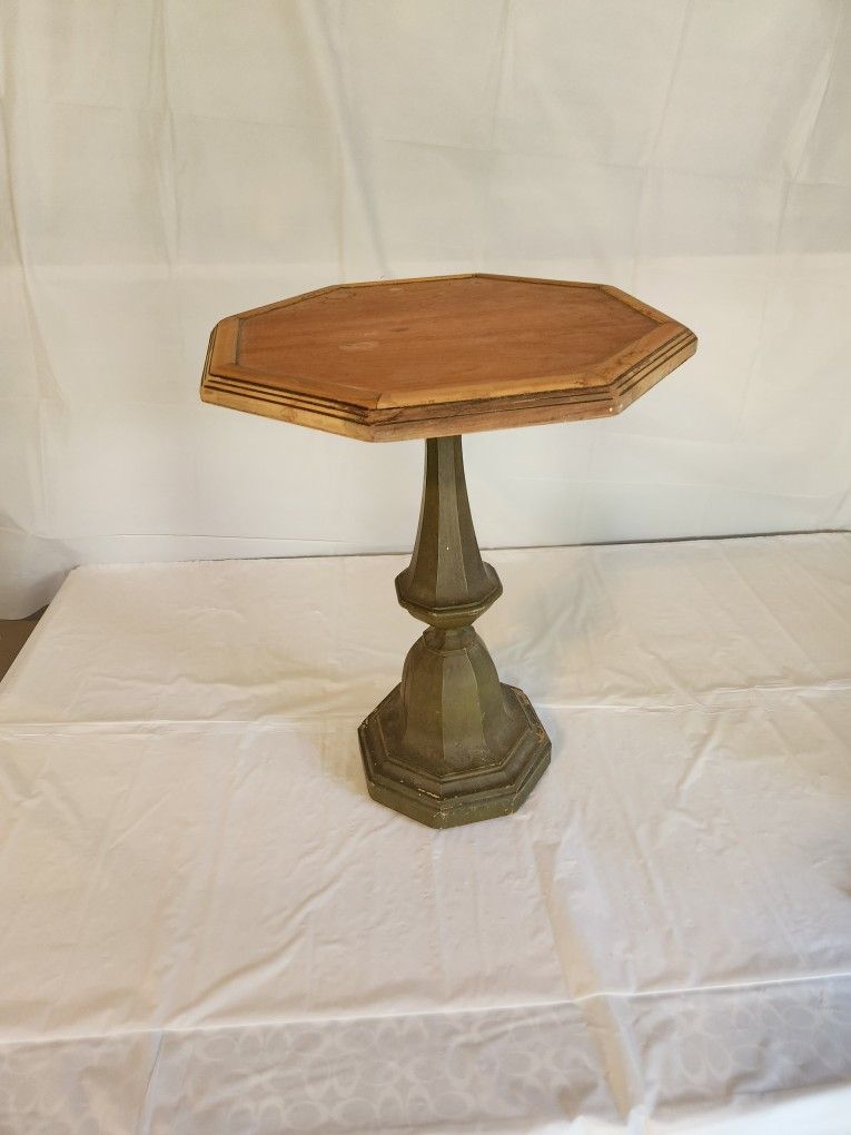 Solid pedestal base with an octagonal wood top. Great as a lamp stand, accent, or telephone table. Light vintage wear, sturdy and ready to use. I can meet in Clovis, Fresno, Madera, Coarsegold, and Oakhurst Depending on the day and time.