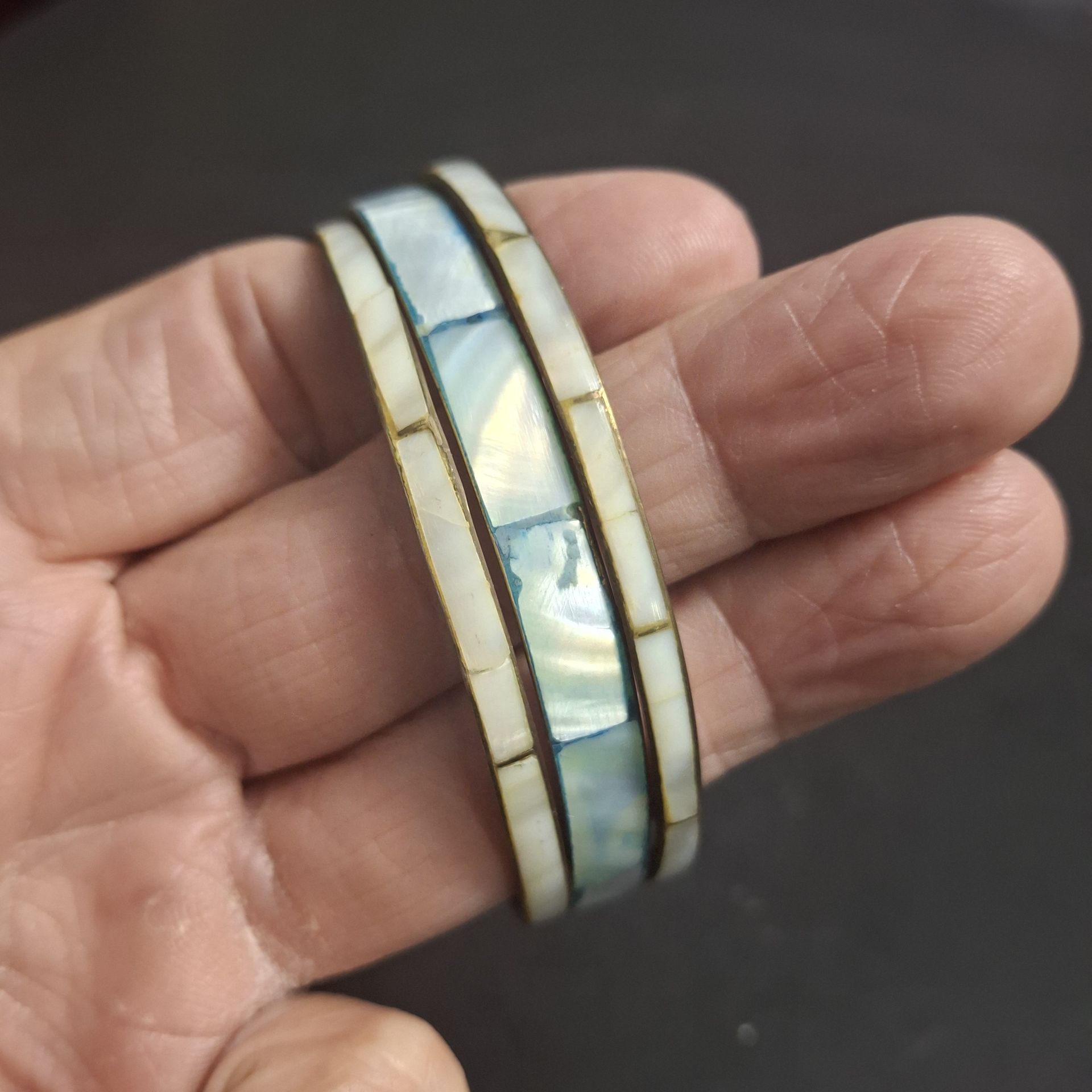 Mother Of Pearl Metal Bangle Bracelets 3PC Set Ivory & Turquoise 2 1/2" Opening