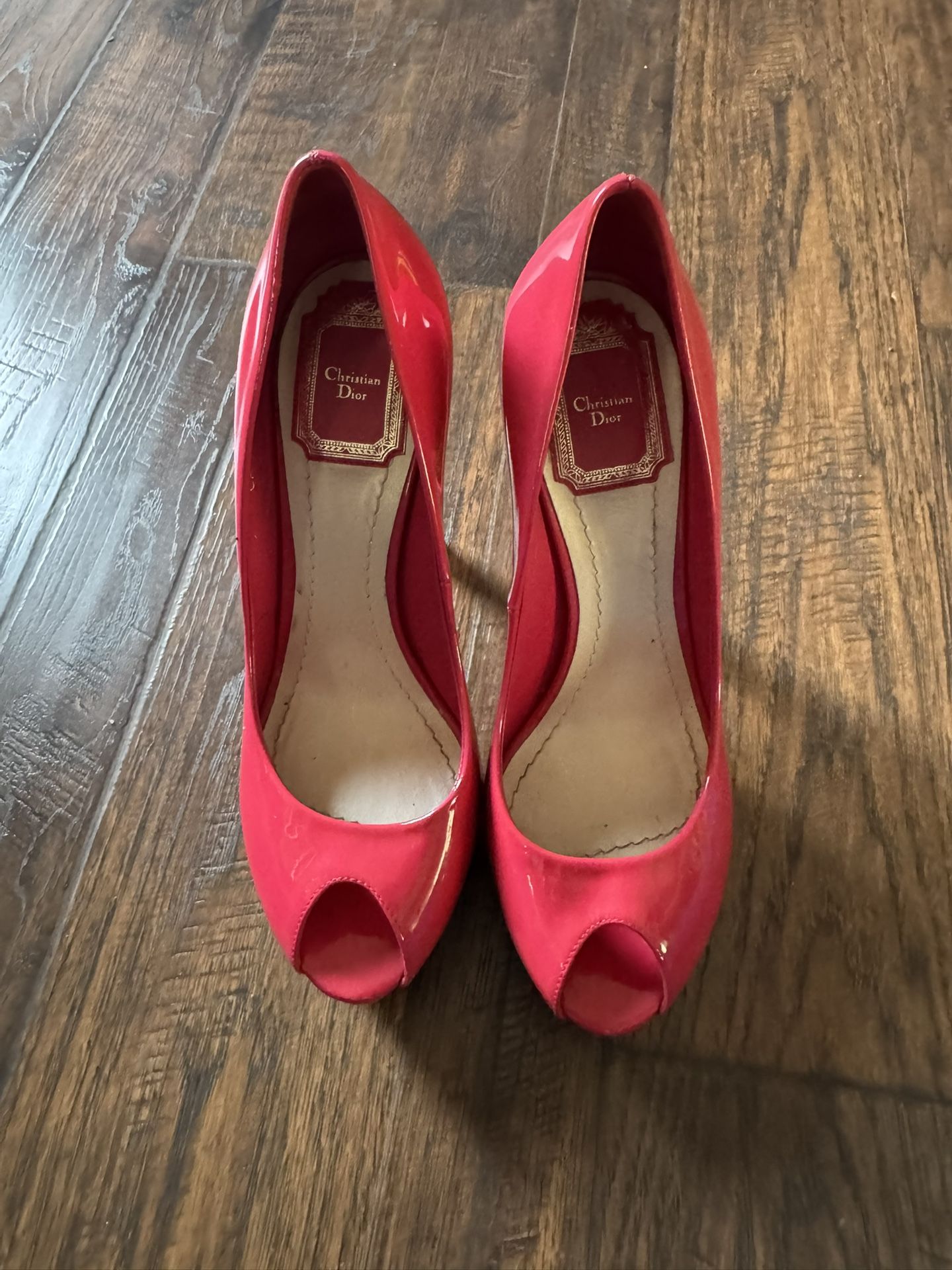 Dior Miss Dior Pink Coral Patent Leather Peep Toe Stiletto Heels Pumps size 37 Made in Italy Christian Dior Pink Patent Leather Classic Miss Dior Pump Heels 37 Super high heels, 5 inches. Mega sexy! Bright color. Shiny patient leather. Comfortable pair with front platforms. Selling a pair of Red Christian Dior peep toe shoes in size 37. Shoes are in good preloved conditon scuffs on sole (as pictured).