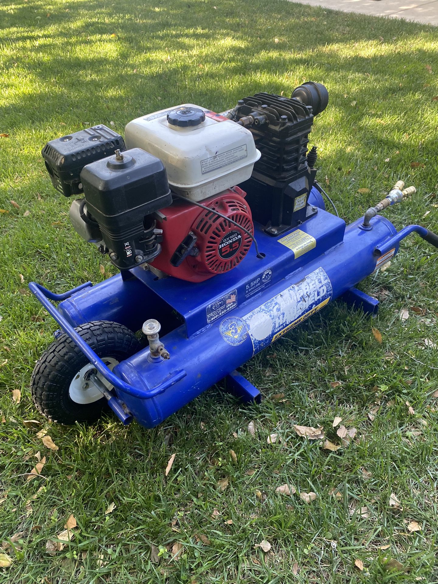 Campbell wheelbarrow air compressor Works great, turns on first pull HondaGX160 engine with 5.5 hp 125 max psi, 8 gallons Triple quick release manifold