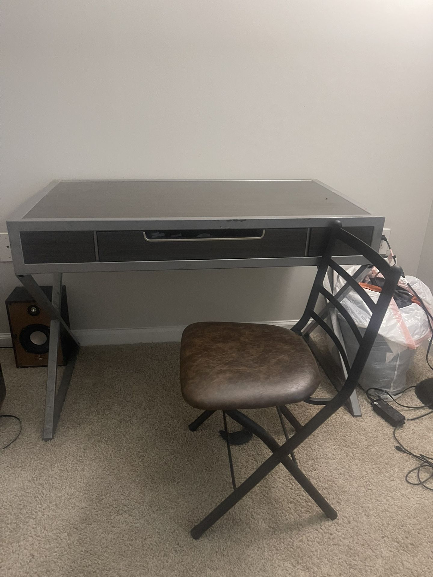 Leather seated chair with a brown desk with metal rails. Must be able to pick up. pretty heavy well assist.