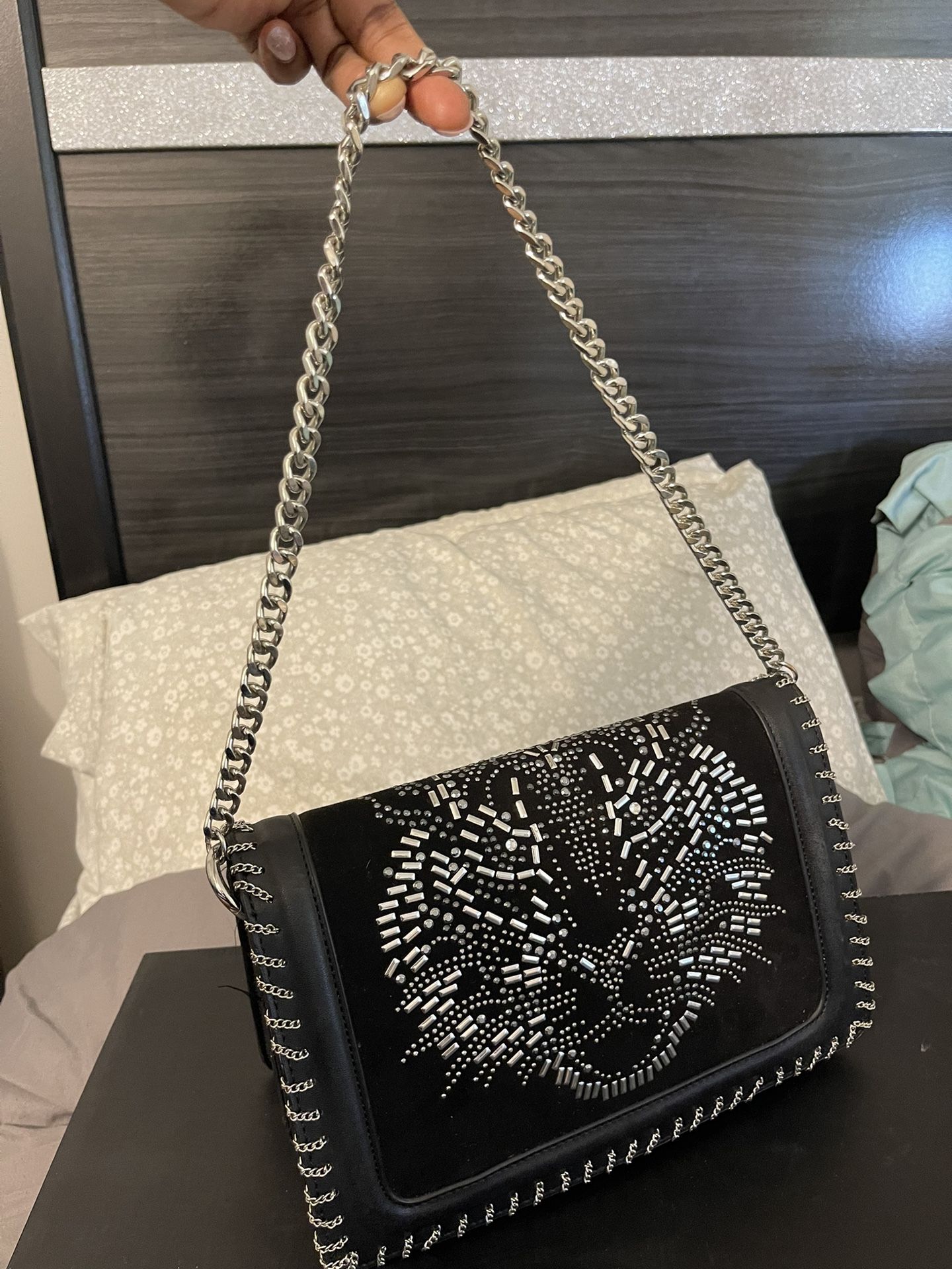 Worn maybe once or twice. Super spacious on the inside with 2 different compartments as well as a zippered compartment.