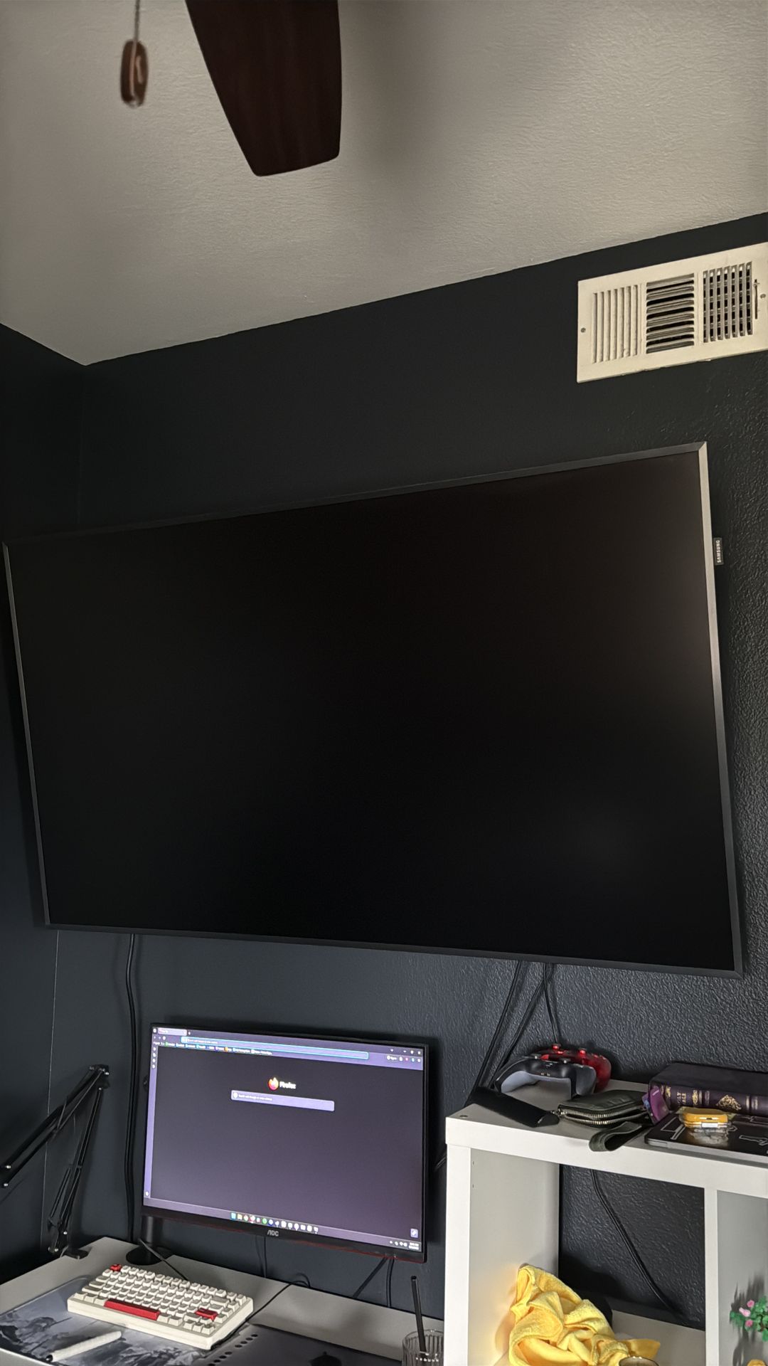 Has a little scratch and a dent. Still works fine just no need for it anymore. Comes with the wall mount and 1080p Hd apple tv. Remotes included of course.
