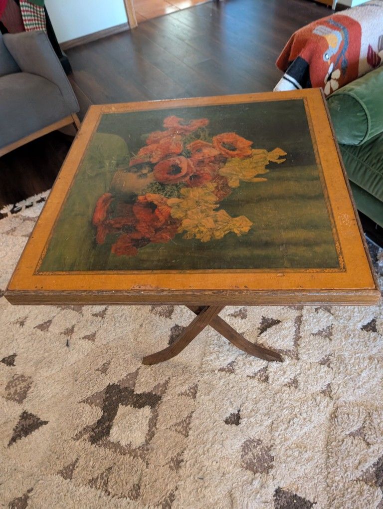 Decorative hand painted antique table. Wood carved base. Floral inlay. Beautiful place to set flowers or pictures. Antique. Vintage.