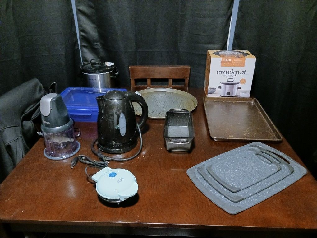 Each item you see is $10 2 separate 2 qt Crock pots 1 cast iron Lodge bread/Meatloaf pan Pizza pan One large 11 x 17 baking pan Ninja food chopper A set of 3 cutting boards One electric kettle Large blue plastic container Dash mini waffle maker