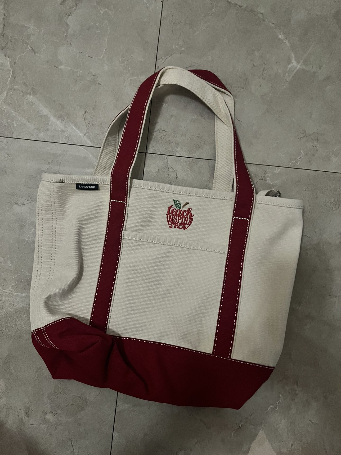 Embroidered with “Teach, Inspire, Grow”. Brand new. Never used. Pockets and storage inside