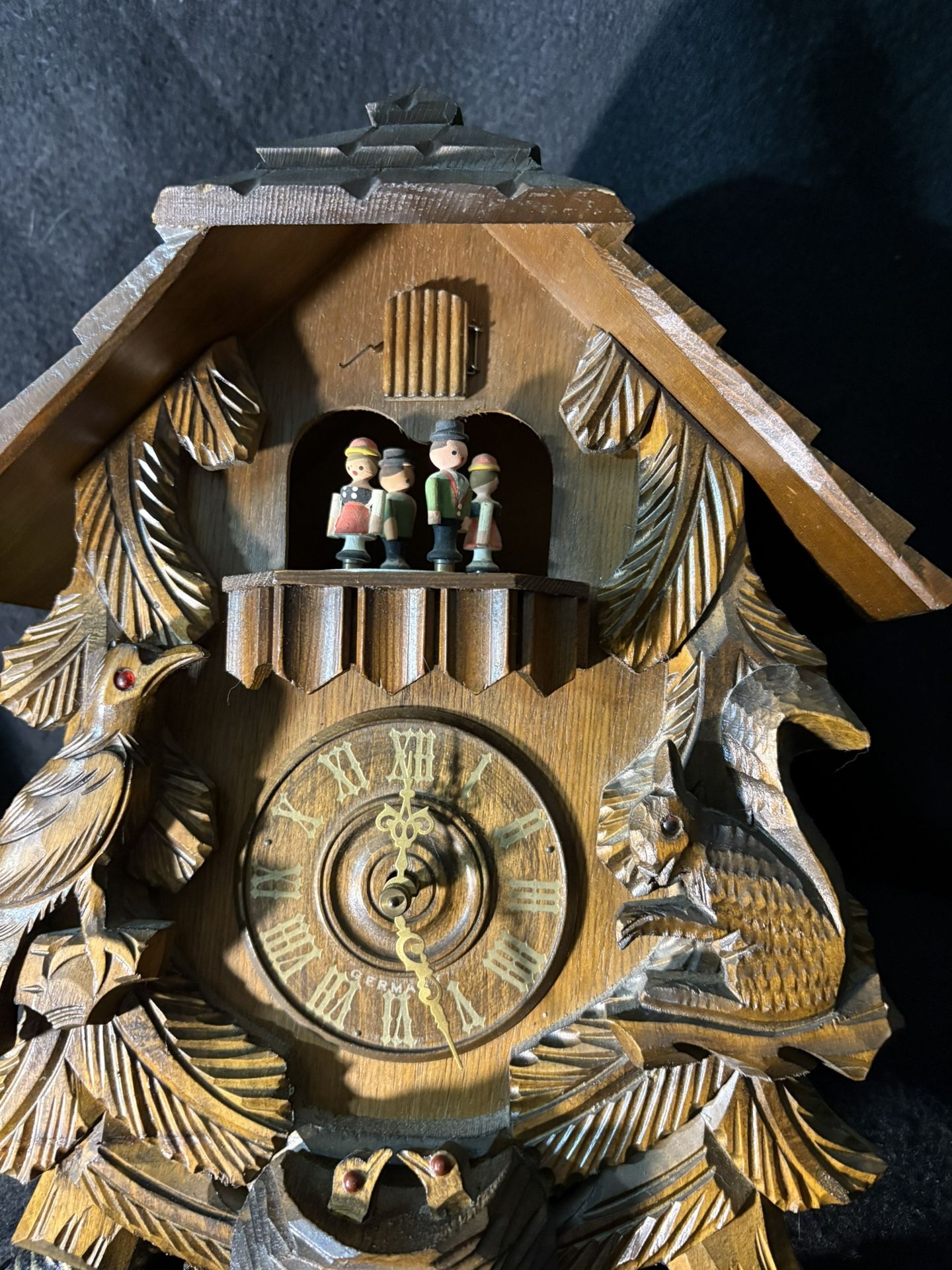 vintage German Black Forest cuckoo clock with intricate wood carvings. It features hand-carved birds and leaves, a common design motif for authentic Black Forest clocks. The clock face has Roman numerals. Such mechanical clocks are typically weight-driven and handcrafted in the Black Forest region of Germany. The term "GERMAN" is visible on the clock face, indicating its origin.