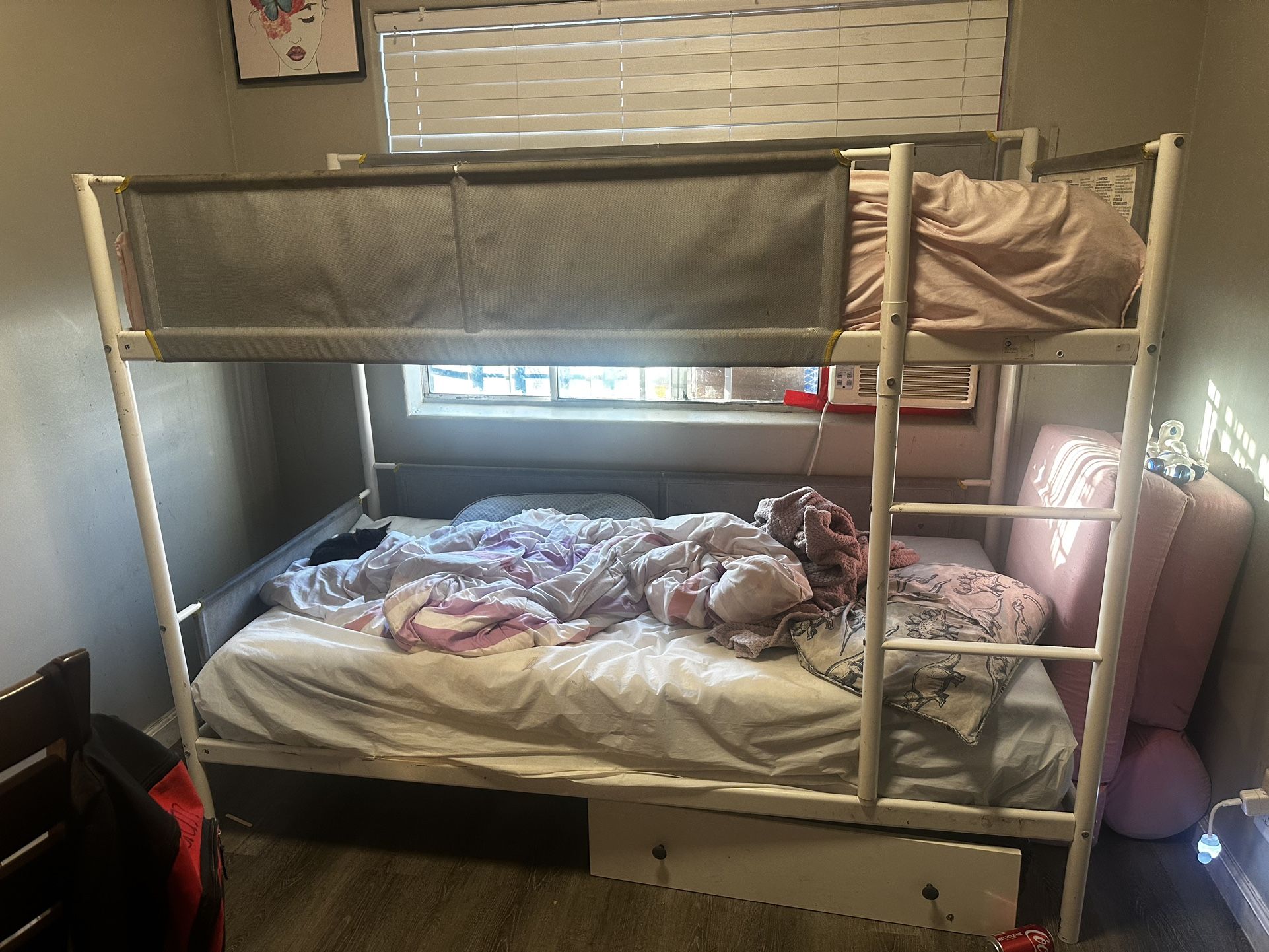 Twin bunk bed. Very sturdy. The gray covers were removed and washed. It’s already disassembled and ready for pick up. Bring a truck.