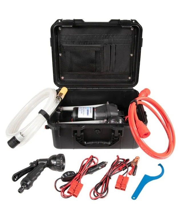 WaterPORT HydroSpray, 12v, 3.4GPM, 35psi, HS1000, New Factory New Description New WaterPORT HydroSpray, 12v, 3.4GPM, 35psi, HS1000 This pump is ready for any adventure, whether your camping, boating, overlanding or find yourself in an emergency situation, the HydroSpray Pump will turn any water source into a 35PSI shower system. With a 12V plug or battery terminals for power, this pump is ready for any situation. Conserve fresh water, while rinsing and cleaning up and then store away easily for next time. Product includes: 8-Foot outlet hose, 5 Setting Spay Nozzle, Filter Wrench, 8-Foot power cord (both 12v plug and battery terminal), 8-foot inlet hose with filter Features Inline filter for use in lakes, rivers, or any water source. Rugged ABS Case. 406lb water pump. Specifications Max Flow: 3.4GPM Volts: 12v Dimensions: 14x12x6.5 inches Primary Construction Material: ABS Plastic Max pressure: 35psi (2.5 BAR) Amp Draw: 7A Duty Cycle: Intermittent Model # HS1000 Warranty: 90-daPro Product Weight: 11 lbs. Product includes: 8-Foot outlet hose, 5 Setting Spay Nozzle, Filter Wrench, 8-Foot power cord (both 12v plug and battery terminal), 8-foot inlet hose with filter, ABS Case