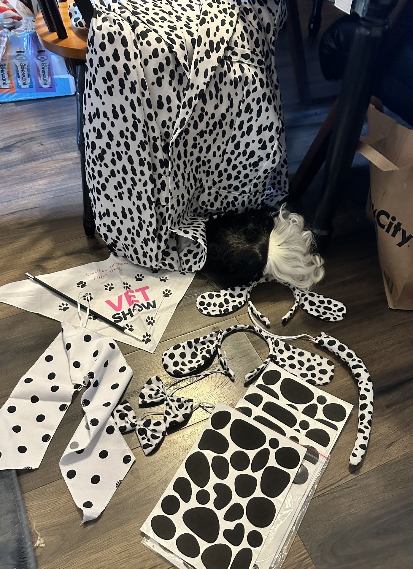 Cruella wig, XL Dalmatian suit jacket with pants, tail, ears, bow ties, lots of spot stickers, cigarette holder, Dalmatian sash, optional pet bandana