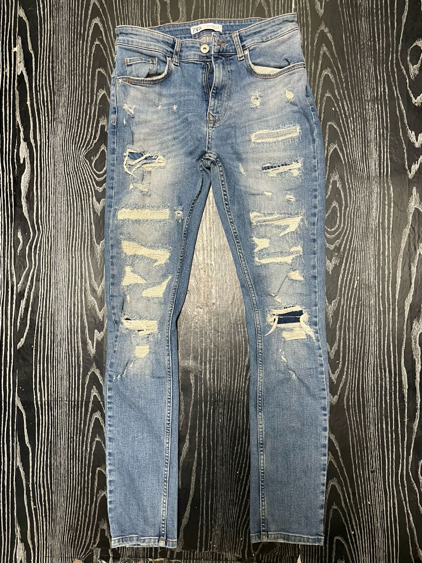 The product is a pair of Zara skinny jeans for men in size 30. These jeans are designed with a regular fit and a 30-inch inseam, worn a few times but in good condition
