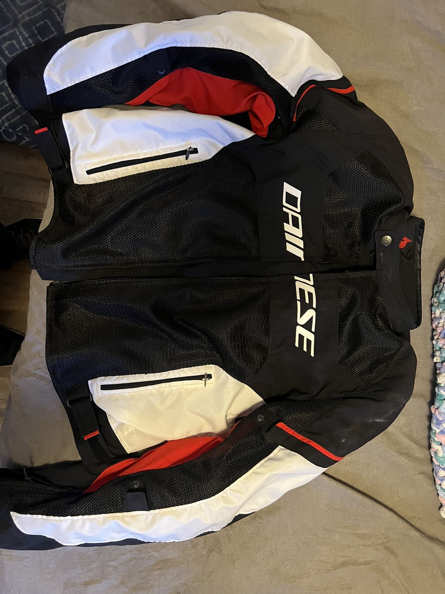 Mens XL motorcycle jacket. Used only once and has shoulder and elbow pads, with a back plate.