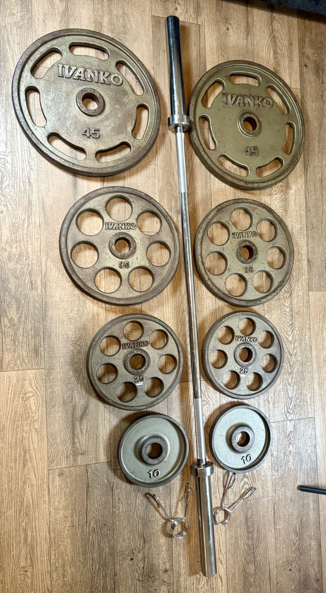 The Ivankos are gently Used. This is not cast Iron plate, this is machinated metal. A Beautiful Vintage Classic. Price of plates: $460 Price of bar (buying the plates) $80 Price of bar alone: $95 To expensive? … look for average weight plates: pretty sure you will found on my profile those. (2) plates 45 lbs (2) plates 35 lbs (2) plates 25 lbs (2) plates 10 lbs (1) Curl Bar 40 lbs (2) Spring clips Total: 270 lbs.