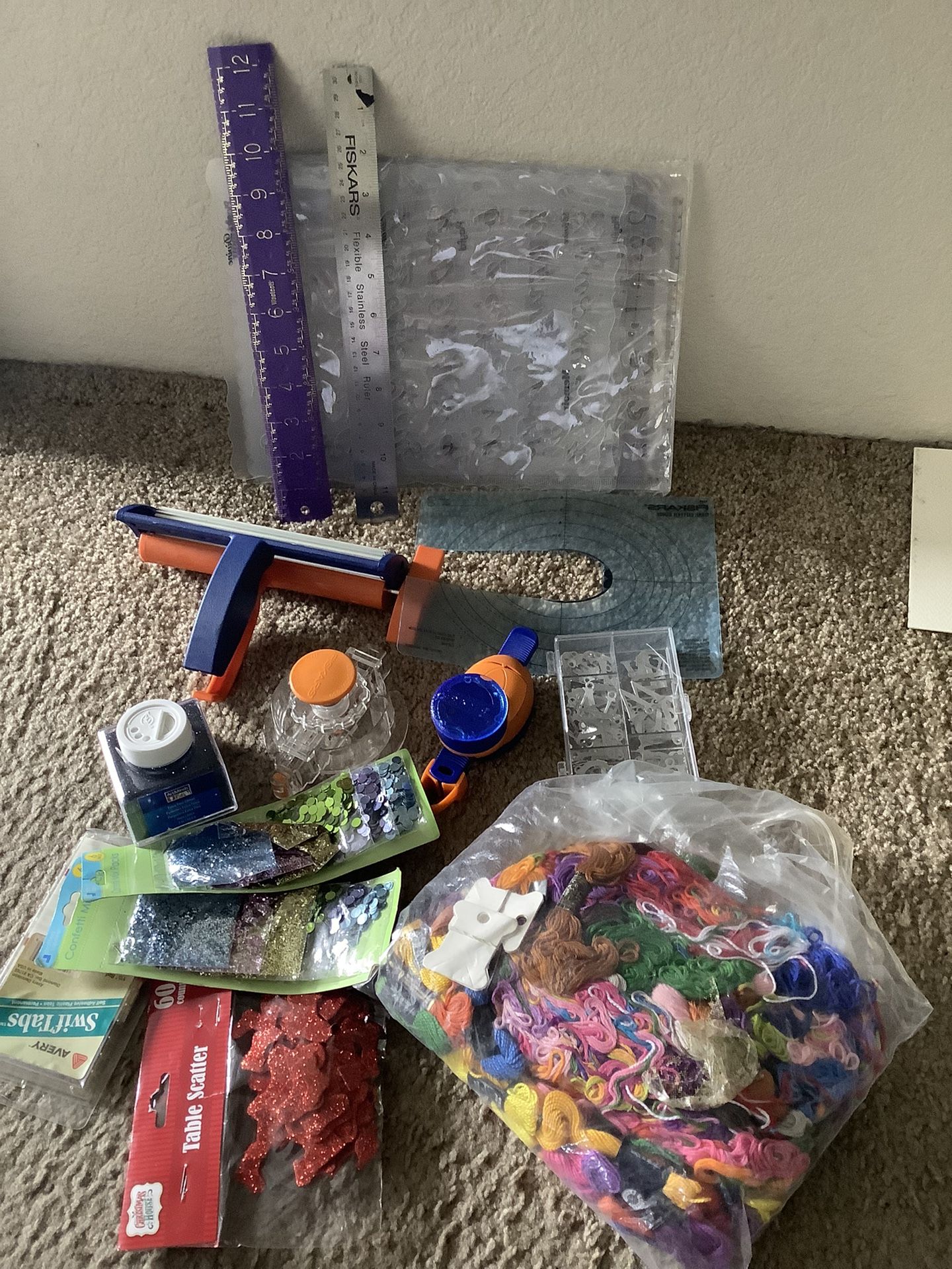 Multicolor fibers for making friendship bracelets, scrap booking , tools, alphabet stencils , glitter material, cutting board.