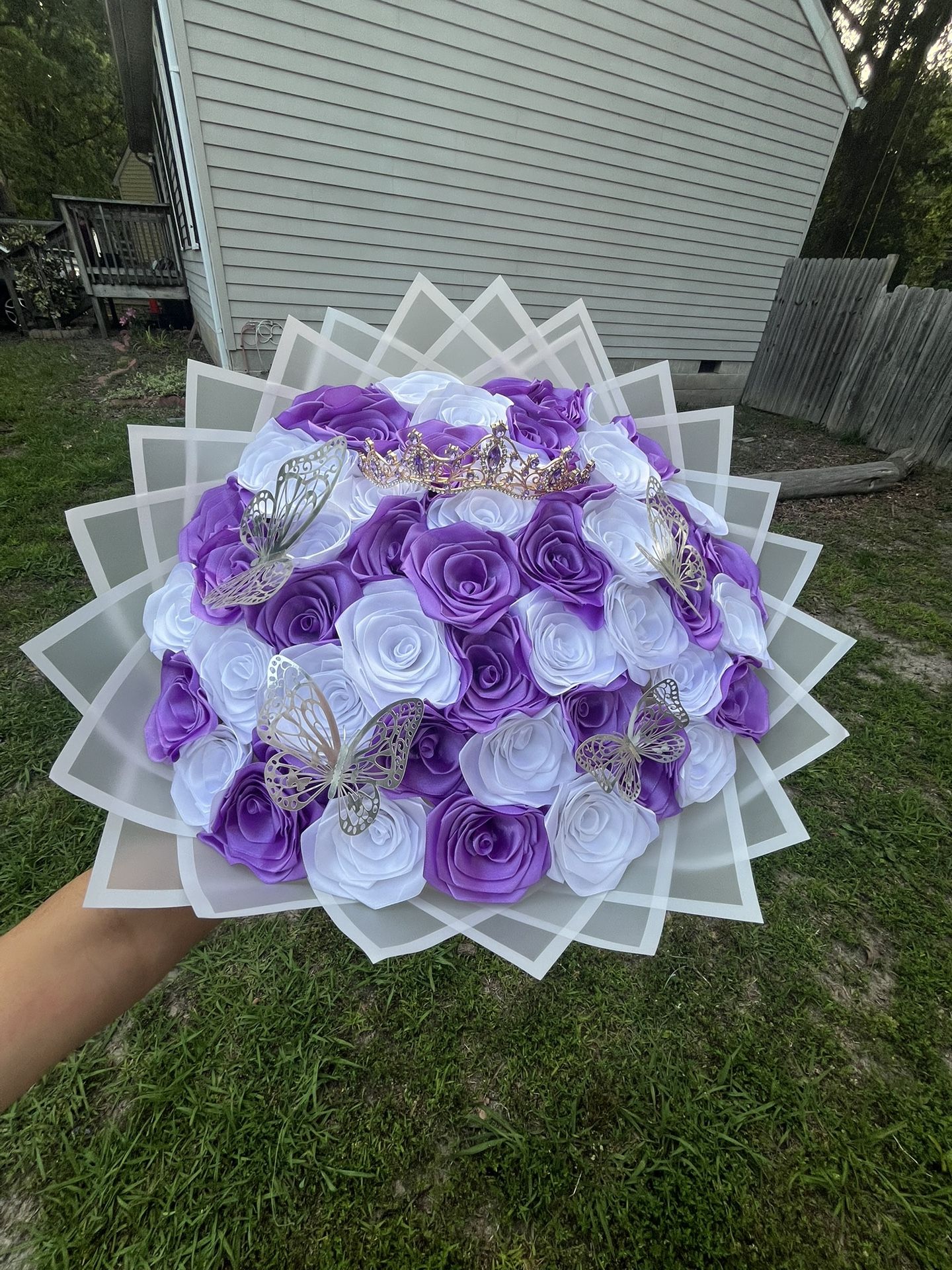 A handcrafted bouquet of 50 ribbon roses a blooming crown of lilac and white satin, adorned with silver butterflies and a jeweled tiara. Perfect for gifting, decor, or simply cherishing something beautifully made. Please Note: We accept cash only for all orders. Pick-up is available Monday through Sunday from 11:00 AM to 5:30 PM. No other payment methods are accepted—cash only at the time of pick-up. Thank you for your understanding!