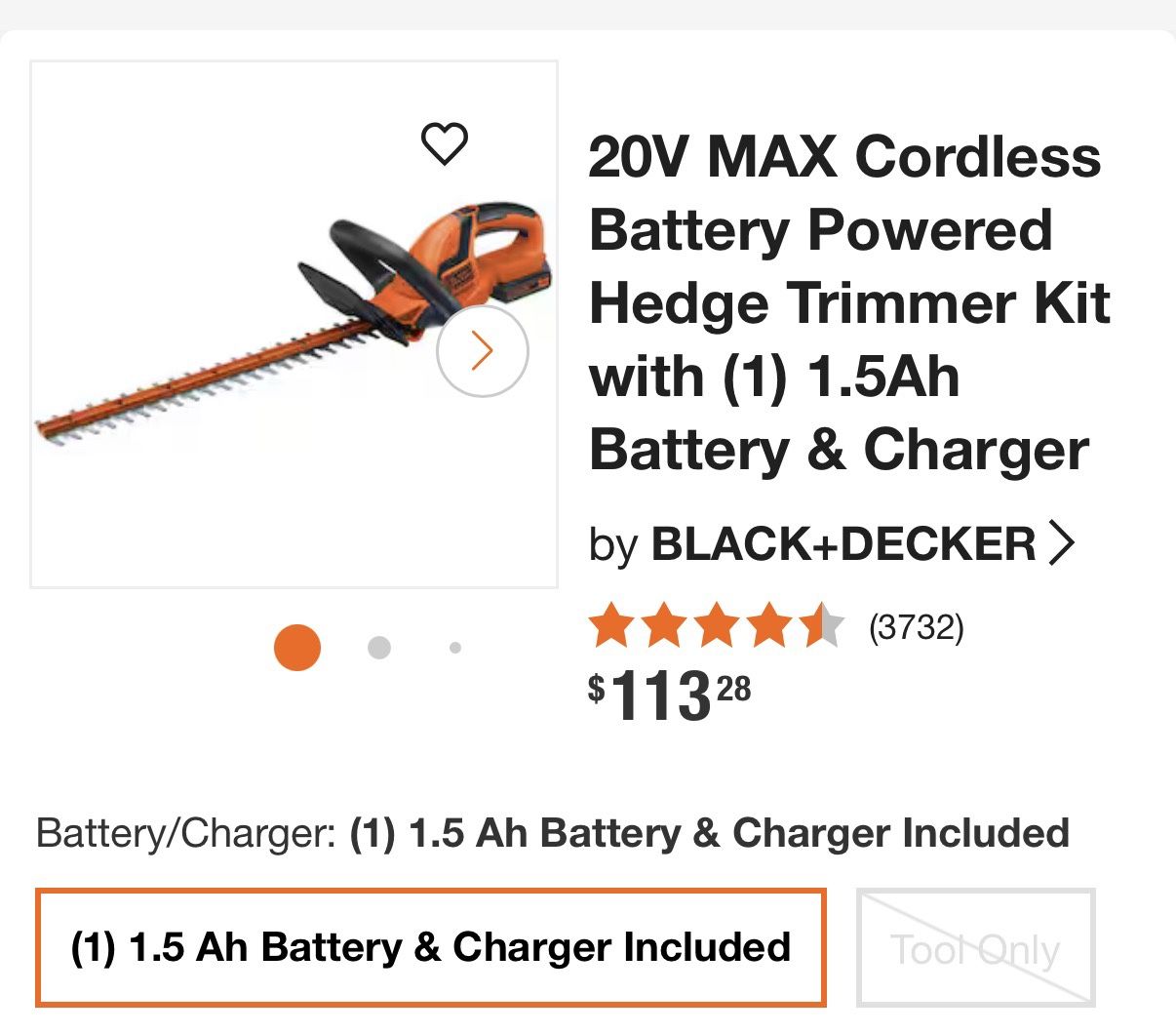 Gently used Black & Decker 20V MAX* cordless hedge trimmer with 18-inch dual-action hardened steel blade for precise, low-vibration cutting. Lightweight (approximately 5.7 lbs without battery) and ergonomically designed with full-wrap front handle and soft-grip rear handle for comfortable extended use. Key Features: • 18-inch blade cuts branches up to 7/16-inch thick • Powered by interchangeable 20V MAX* lithium-ion battery system (battery and charger not included in this listing) • Built-in safety lock-off switch • Durable orange blade guard include