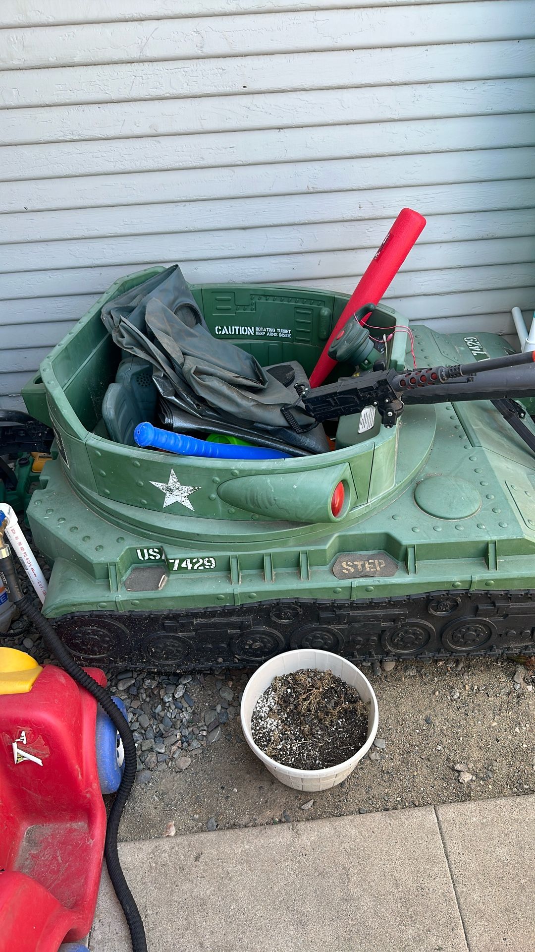 Tank just sitting here . I’m not sure if anything is wrong with it but it does turn on when battery is charged . 2 batteries and charger included . Just sitting and taking up space . Need gone .