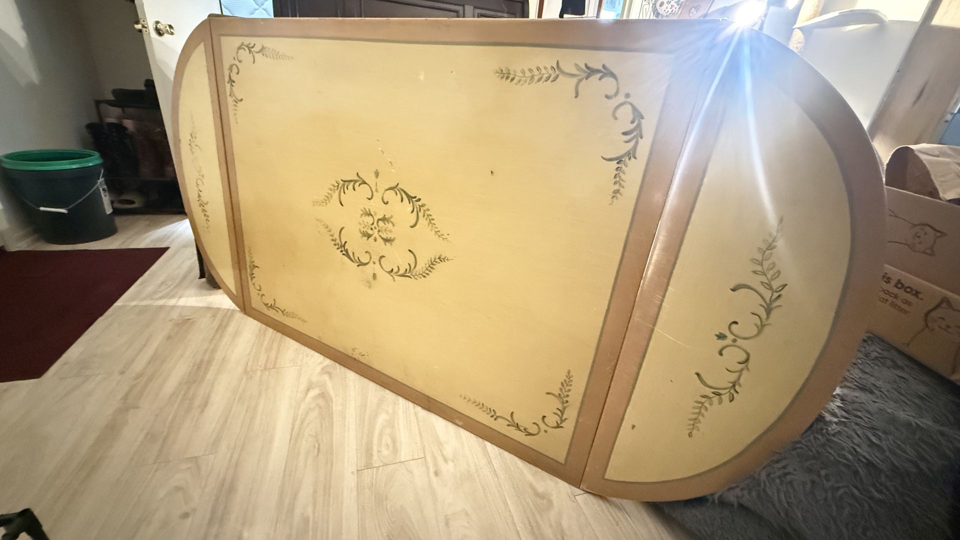 Vintage drop-leaf dining table with a unique hand-painted floral design. Both sides fold down, making it perfect for small spaces, apartments, or as a multi-use table. • Drop-leaf style (expand or save space easily) • Solid and functional • Decorative painted top with vintage character • Great as a dining table, desk, or entry table • Shows some wear consistent with age (see photos) Perfect for someone into vintage or DIY projects (could also be refinished for a modern look). Standard small dining table size when fully extended Pickup: West Hollywood