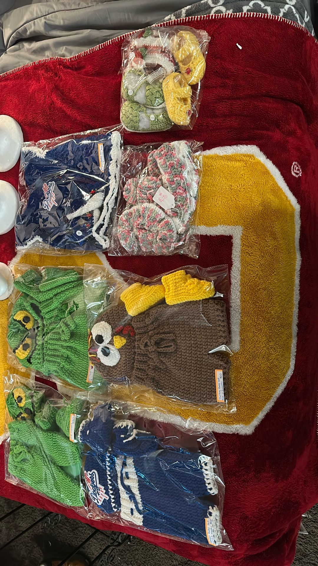 Crochet beanies, all brand, new different styles and different sizes for adults and children. Some dog outfits included for pricing. Please message me. Prices can be negotiable.