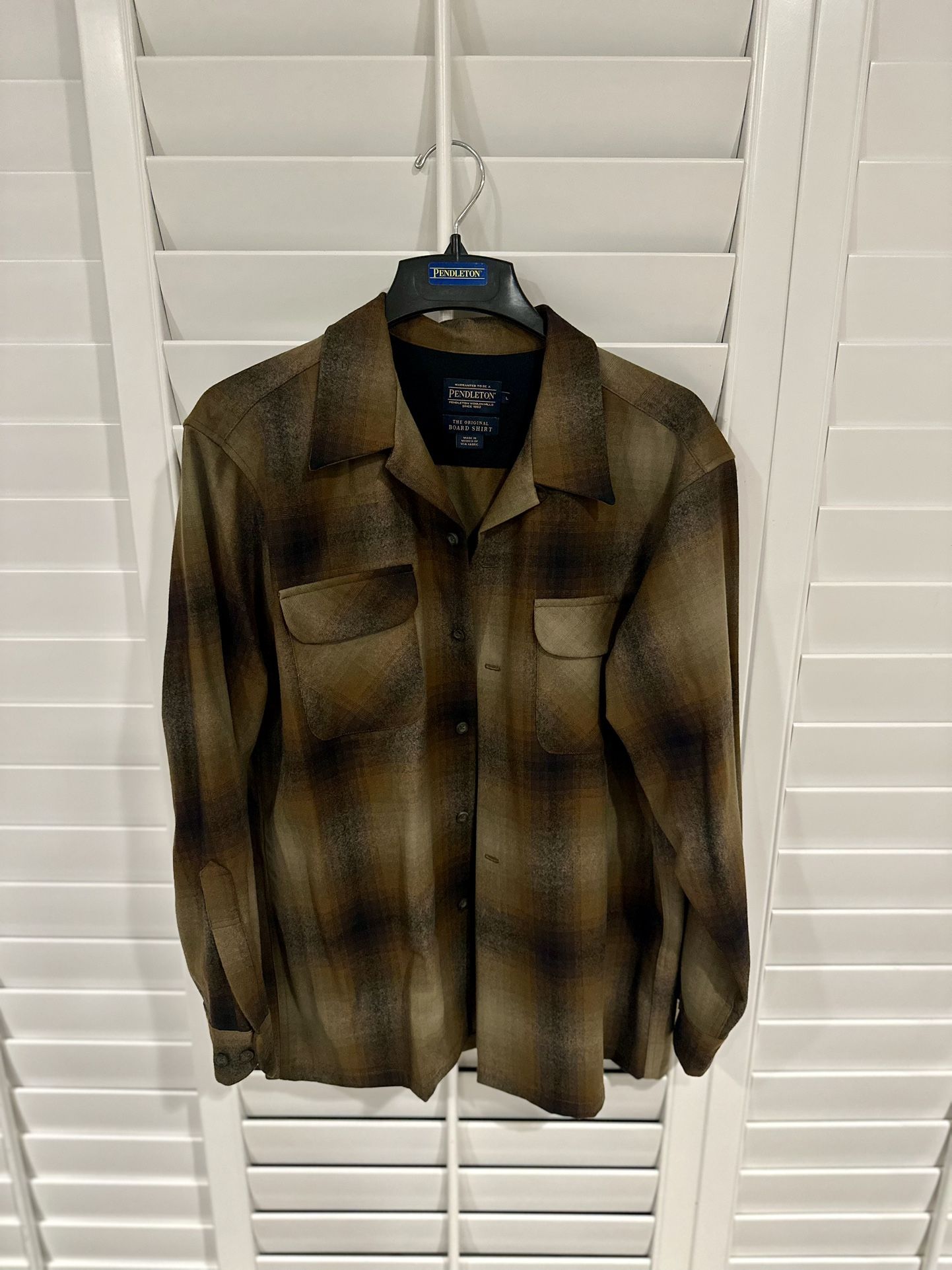 Pendleton board shirt, practically new. Colors are brown, tan and green. Size large.