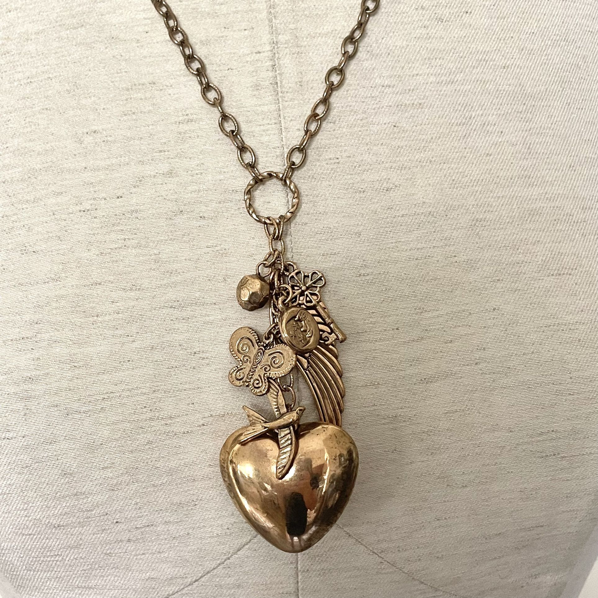 Long necklace Heart with other charms -bird, wing, ball, moon and stars, butterfly and key There is some wear on the heart Lobster clasp with extender Very fun necklace ! Always open to reasonable offers Fast shipping Smoke and pet free home Bundle to save (the more you buy the bigger the discount ) Please see photos for details (they are part of the description) Happy to answer any questions
