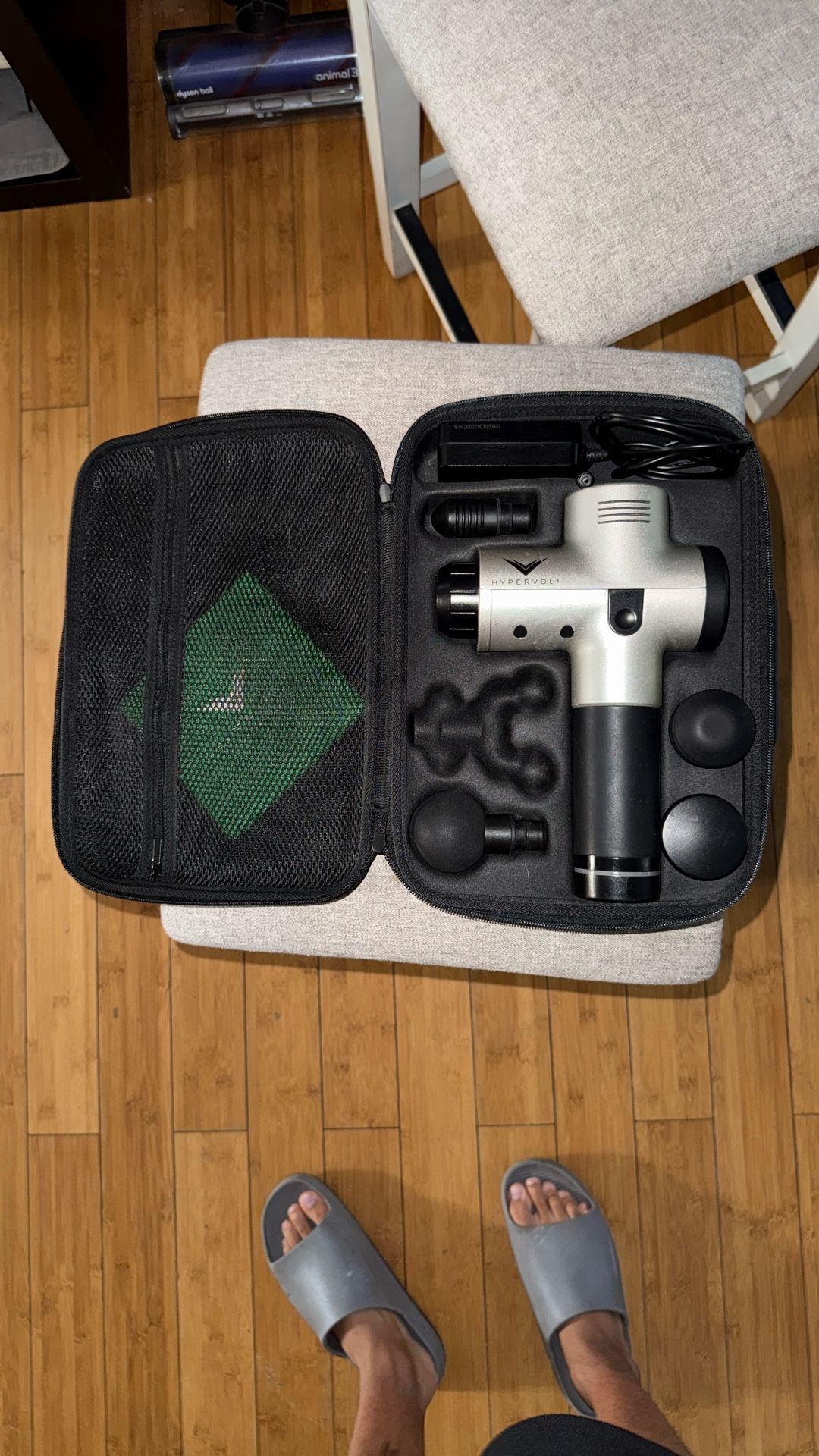Hypervolt massage gun with 4 attachments, charger, and case.