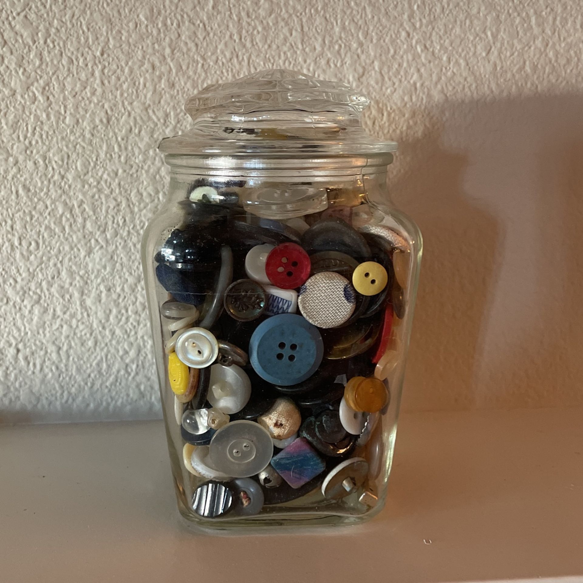 Pretty glass lidded glass canister full of vintage assorted buttons. Measures 6” tall