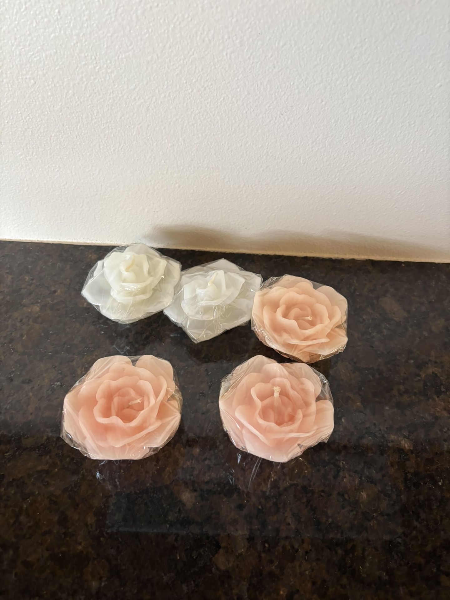 Rose shaped floating candles in like new condition. 3 pink and 2 white. A great add to your home decor.