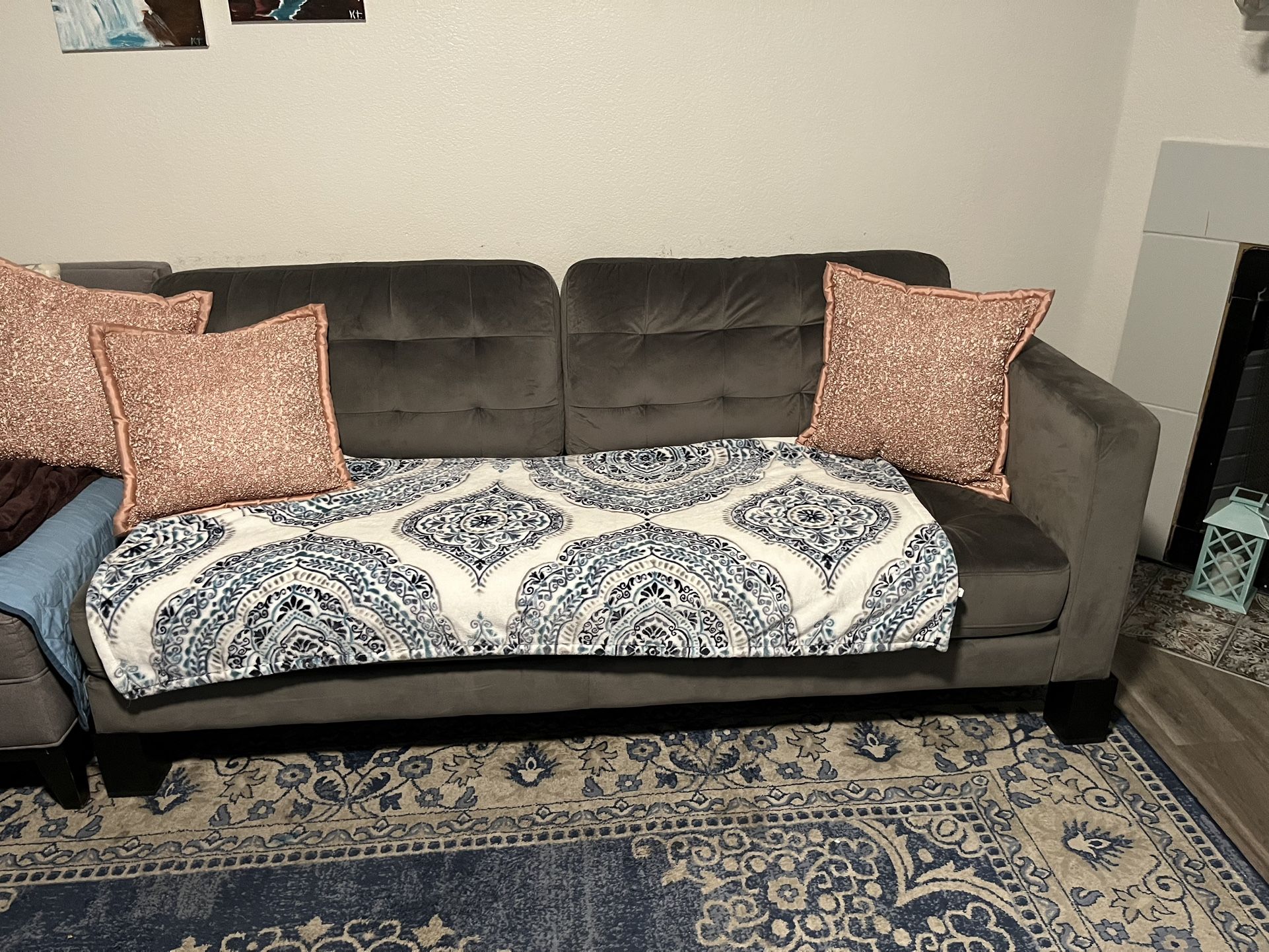 $50 Gray couch, Only one side has arm so can connect or fit well with another couch. Has a minor stain /discoloration shown in the picture. Legs are block legs to make it taller or shorter. And up against a wall holds in place just fine. Pick up only. $50 OBO or best offer, Thanks. Length 74”, width 33 “, depth 24”.