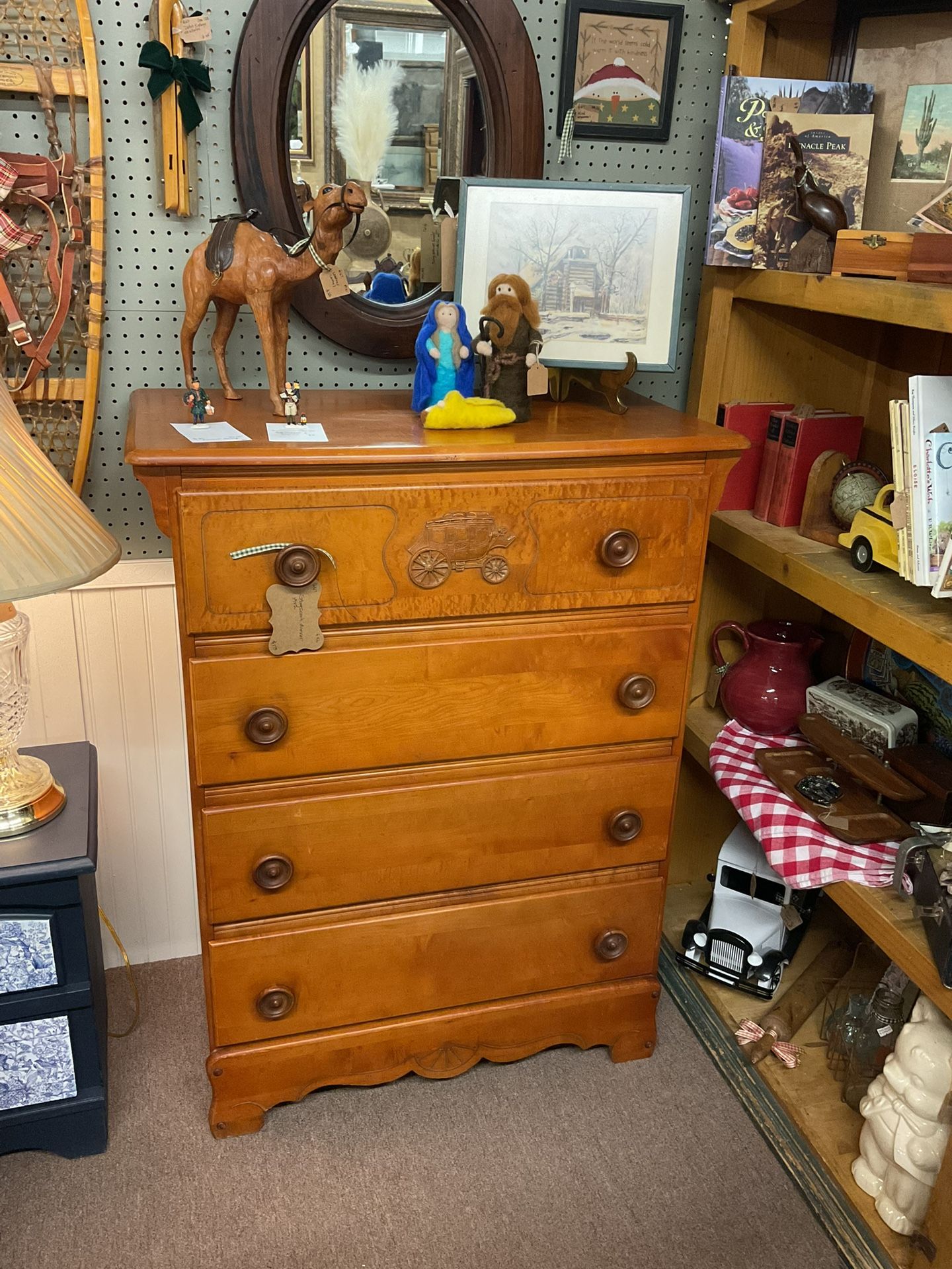 Vintage Stagecoach chest of drawers tall dresser. Has 4 drawers. This can be found in booth B16. See photos for location and other info. Measures about: 34” wide, 18” deep, and 44” tall
