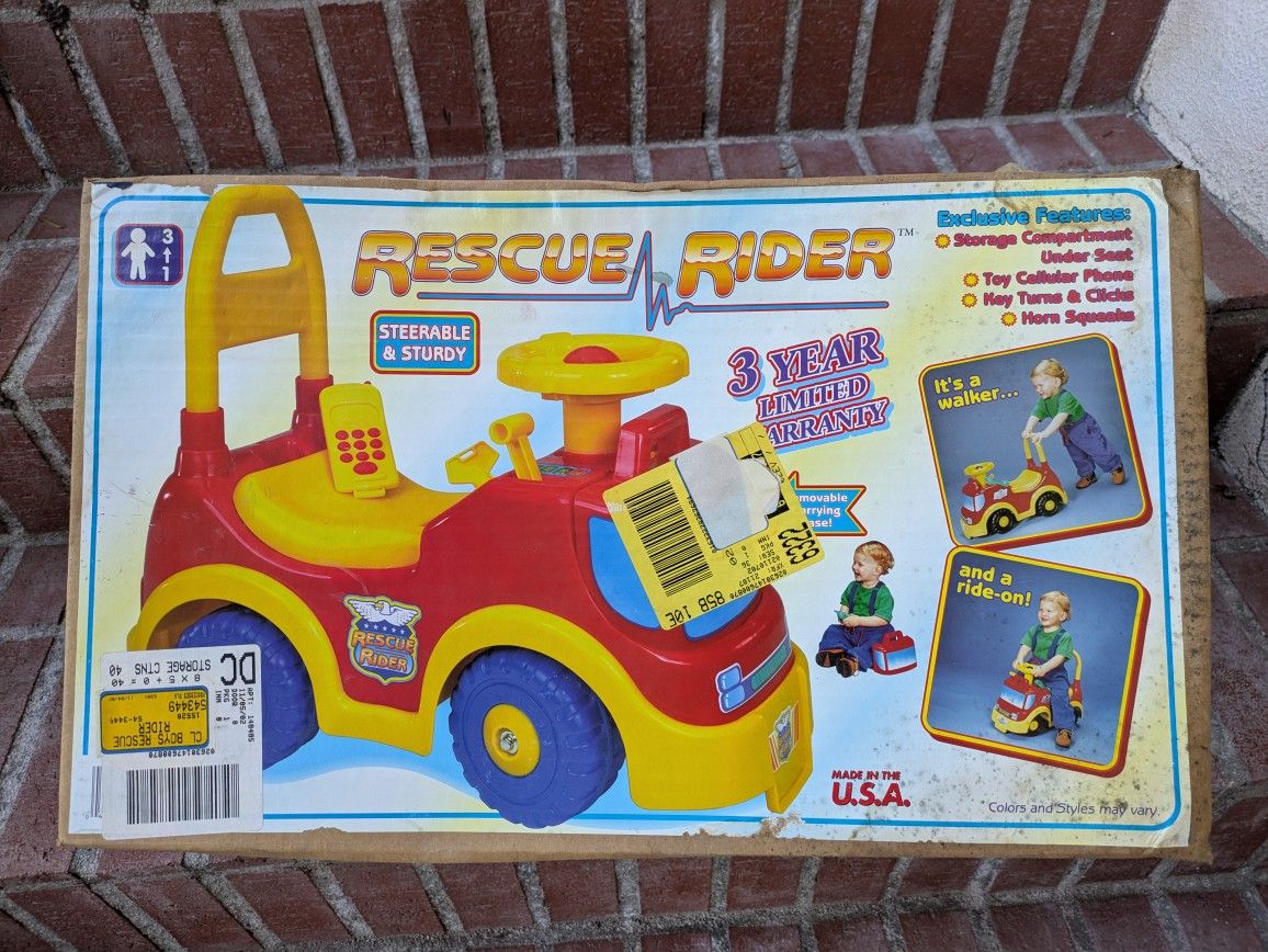 Kids Rescue Rider toy. Brand new, sealed. The box is damaged and a little messed up because it got wet but the item is still okay. Can ride it or push it. Fun toy! Storage under the seat, includes a toy phone, key turns, and has a horn! Plus removable carrying case! Made in the USA.