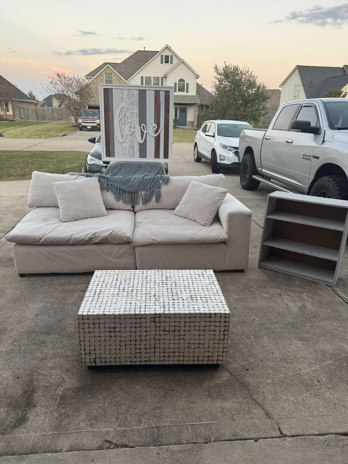 Small couch set with coffee table & love picture frame, grey bookshelf all for $250 Blanket not included Pick up only Lakes of Champions. Must pick up