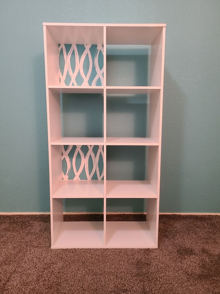 White 8 cube shelf 48x24x11.5 inches from Target Room Essentials. Works vertically or horizontally. One small corner issue pictured.