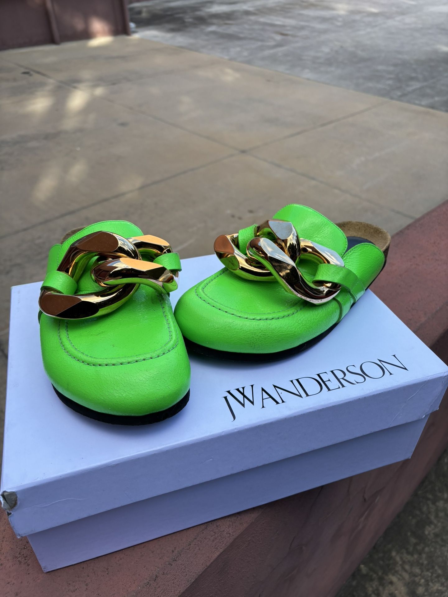 JW Anderson slip-on clogs in neon green leather with an oversized chunky chain-link detail on the front. Includes box.