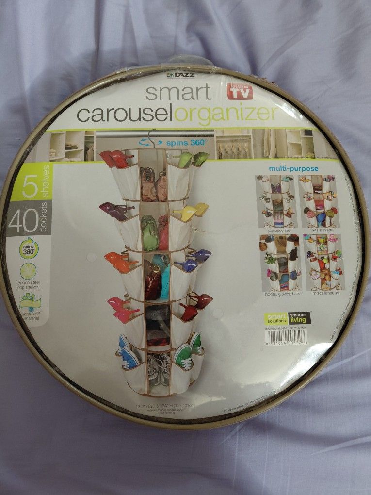 NEW, never opened. Hanging organizer for closet. Spins 360° to access all pockets. 5 levels with 40 pockets. Multi-purpose for shoes, purses, hats, accessories, crafting supplies, toys, etc.
