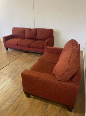 "Order and schedule your delivery at OneUpFurniture(DOT)com Over 50 sets to choose from We are trusted and have 100+ reviews on Google. Excellent overall condition Brand Ashley Furniture No rips, tears, or stains Very comfortable Seat cushions are removable and washable Red Measurements: Couch: 82” Loveseat: 59” Height: 30” Depth: 38”