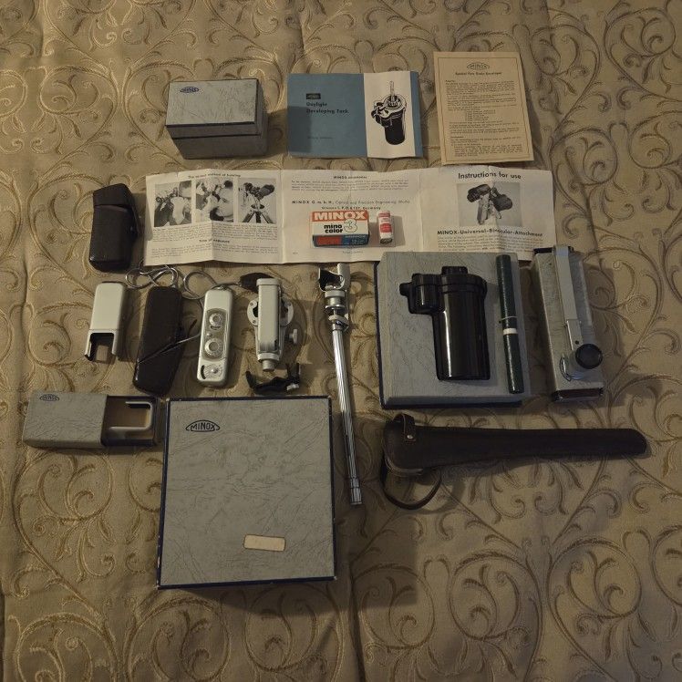 MINOX SPY CAMERA, FROM THE 60'S, COMPLETE WITH ALL COMPONENTS BRAND NEW, CAMERA WAS USED BUT EVERYTHING ELSE IS BRAND NEW IN THE BOX, IF INTERESTED, LET ME KNOW, TALK OVER THE PRICE...