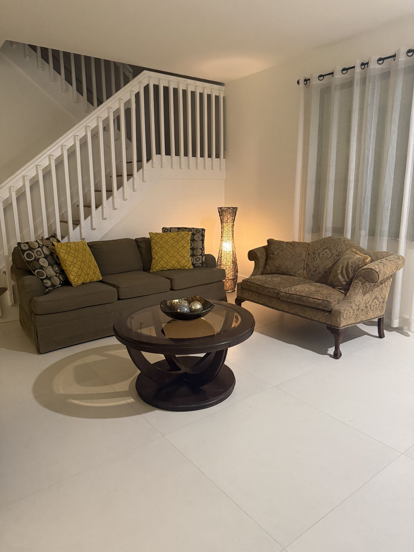 Living Room Set – Sofa, Loveseat & Coffee Table (Good Condition) Comfortable living room set for sale! Includes a spacious sofa, elegant accent loveseat, and a solid wood/glass coffee table.