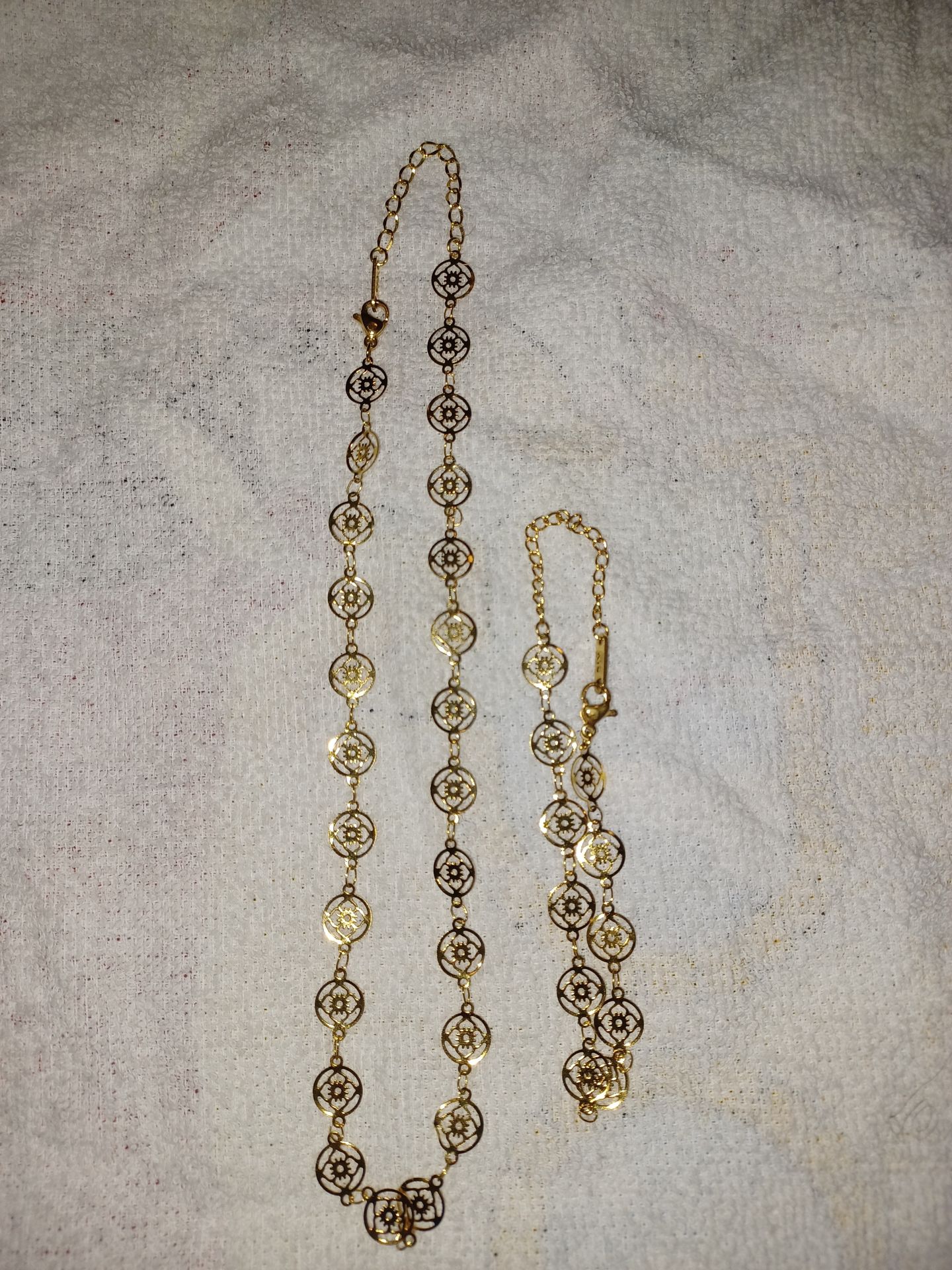 Material - unknown Color -Gold Size- 16 inch necklace normal sized bracelet.