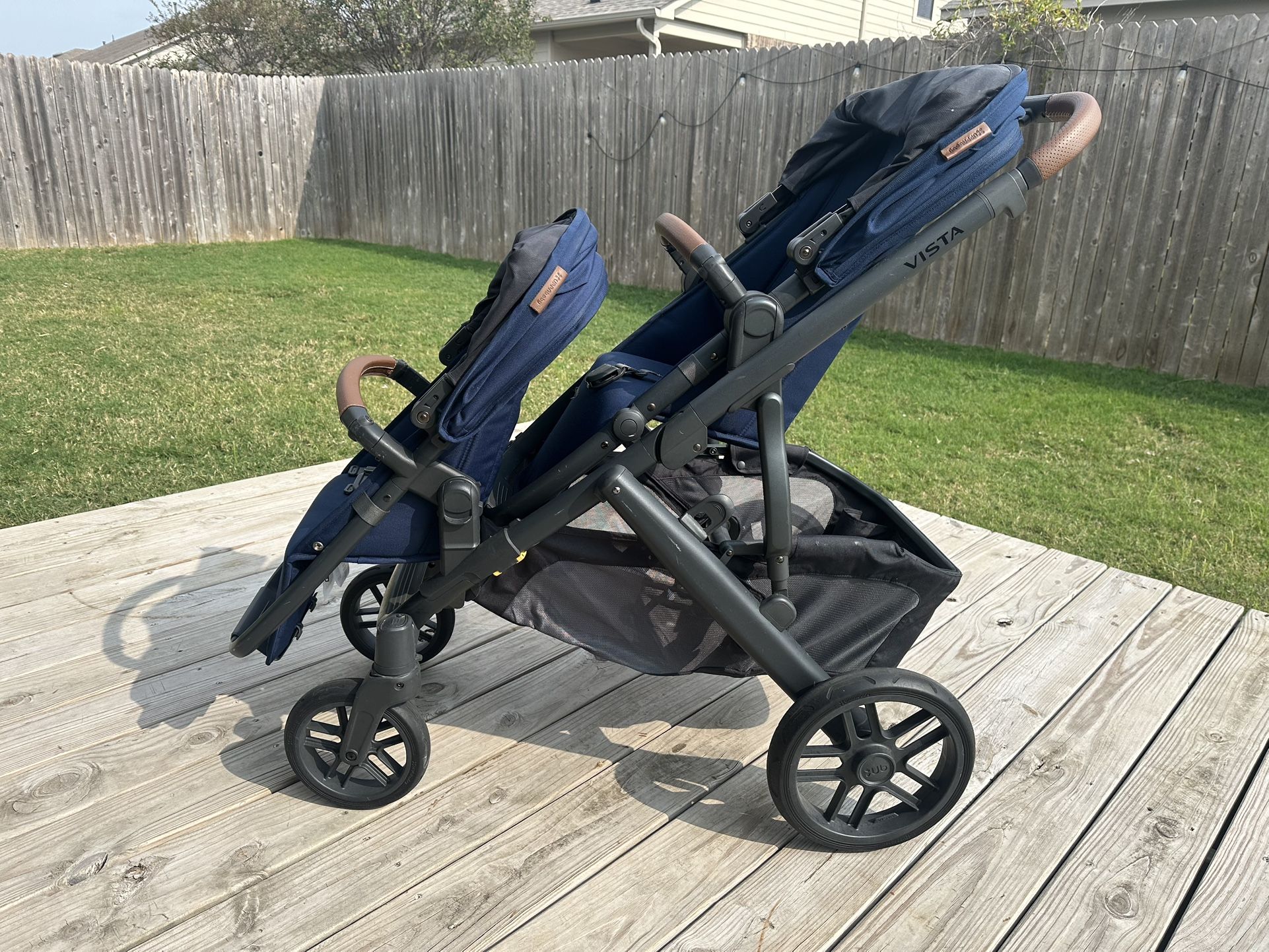 Uppababy Vista V2 double stroller, originally purchased new in Sep 2023, and it is in good working condition. The stroller has some minor cosmetic scratches from normal travel use, which do not affect performance. There is a stain on the upper seat fabric. It may be cleaned or removed with proper cleaning, but it is currently visible. This is a high-quality stroller that easily grows with your family and offers multiple seating configurations. Includes: • Upper seat • Lower rumble seat • Upper seat adapters • Lower seat adapters • Two cup holders Both the upper and lower seats can face forward or backward. Smooth ride, sturdy frame, and easy to fold. Pickup only. No delivery. Cash only