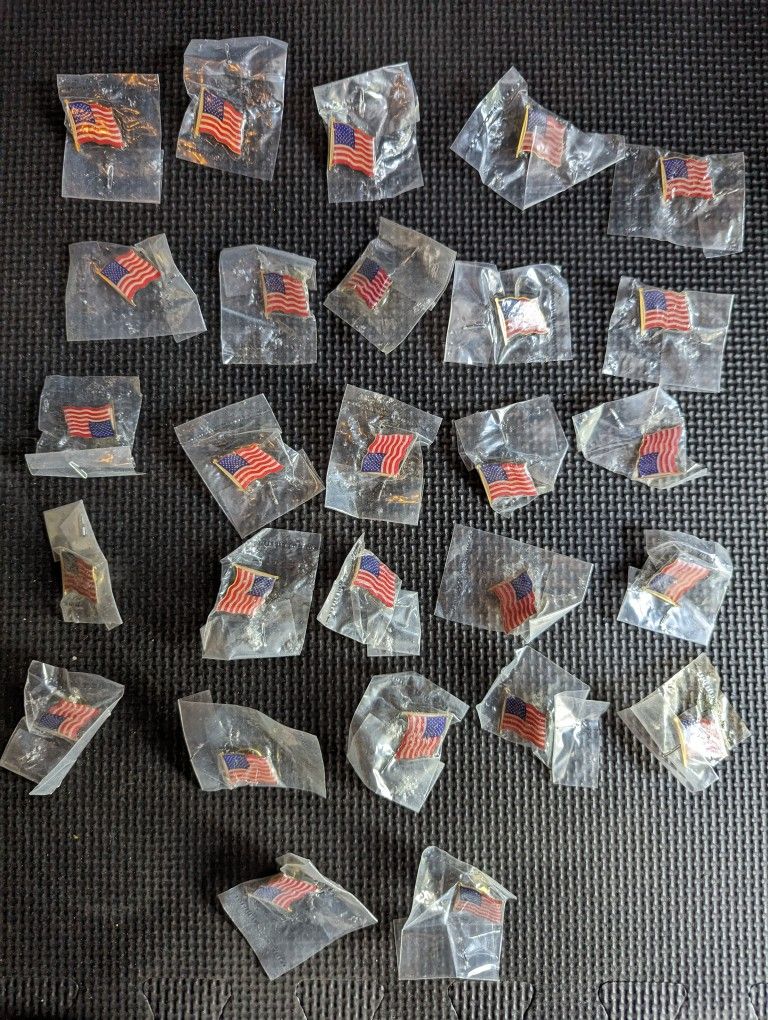 27 brand new, never used, American Flag Lapel Pins! Great for patriotic party favors, boy scouts, girl scouts, Cub scouts, and more!
