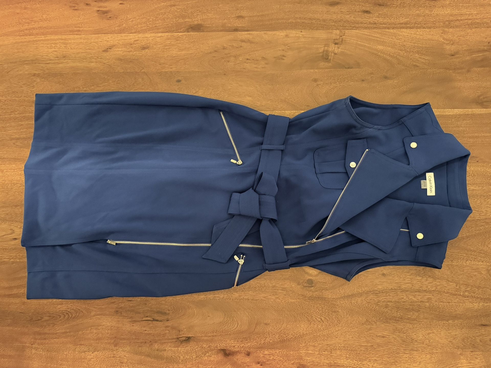 Gorgeous blue Calvin Klein dress with a belt and silver zipper details. Has a collar and short sleeves. The dress is knee-length and has a belt around the waist. There are zippers on the sides and a pocket on the left side.