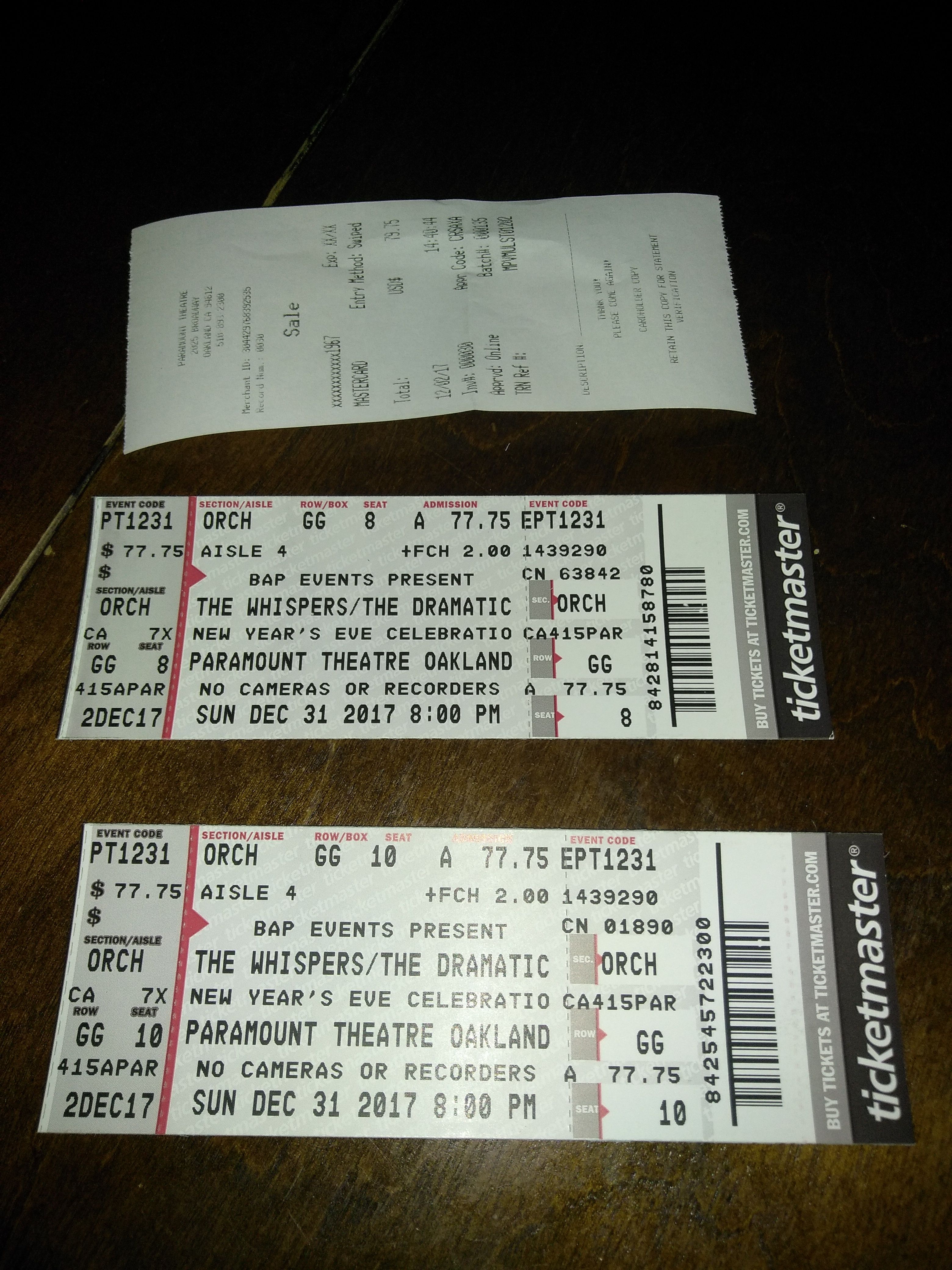 I have two tickets to The Whispers And dramatic Show New Year's Eve $80 tickets for $100 a piece on the floor Orchestra pit