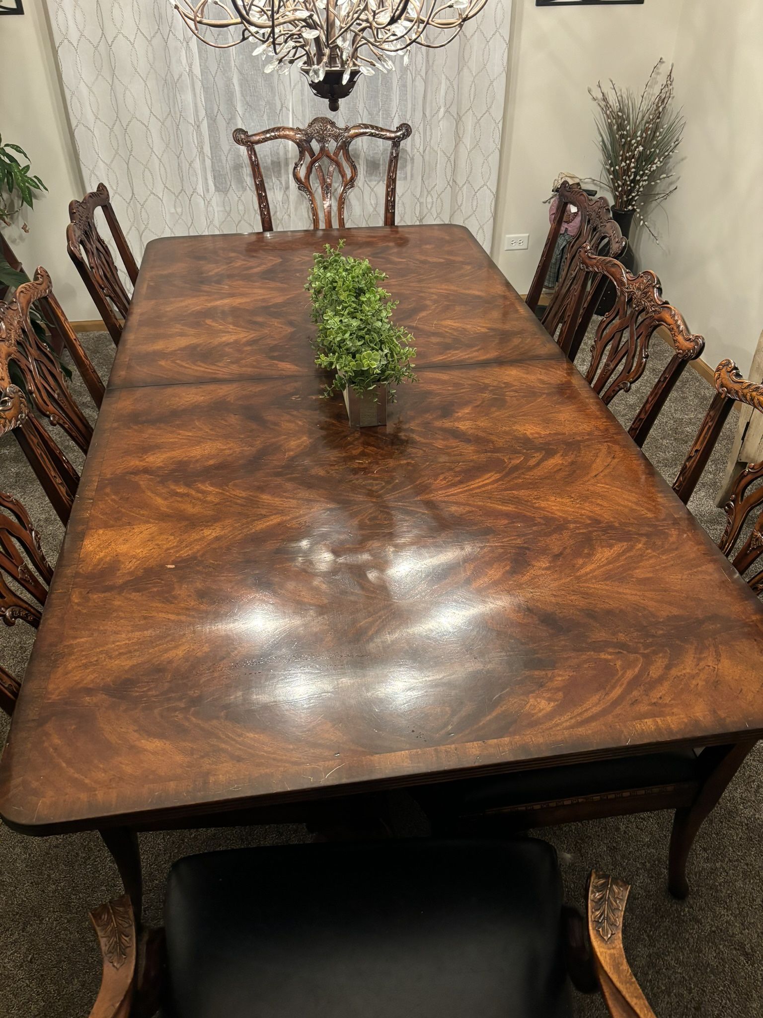We are selling a used mahogany Theodore Alexander table . With 8 Chippendale style chairs This table is gorgeous and looking for someone to give it a new home and would give it the care it deserves . Unfortunately our cat has made a scratch on the top of the table that is repairable