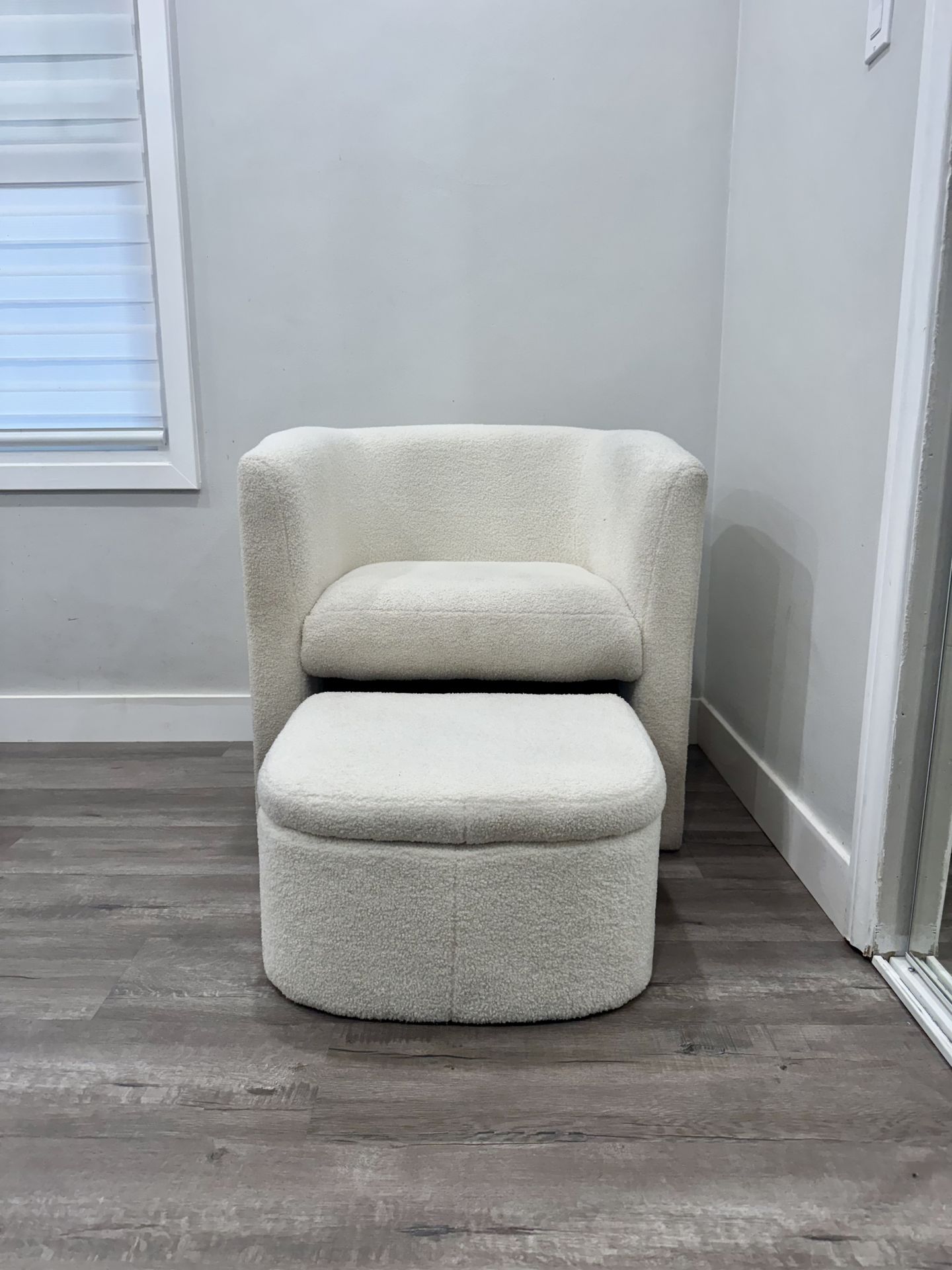 Beautiful modern bouclé accent chairs with matching ottomans – set of two. Soft textured fabric with a stylish curved barrel design that looks great in a living room, bedroom, office, or reading corner. These chairs are very comfortable and modern, and the ottomans slide perfectly underneath when not in use to save space. • Set of 2 chairs with ottomans • Soft bouclé / teddy fabric • Modern curved barrel design • Ottomans tuck under chairs for a clean look • Great condition Originally about $600 for the set. Selling the pair together. Perfect for a living room, bedroom, office, or lounge space. Pickup only. If the listing is up, it’s still available.