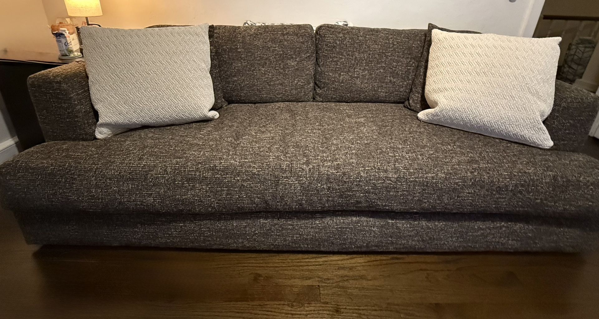 Tweed sofa with cushions. Includes 2 beige pillows. Only one year old. Was $900 will sell for best offer. 89 in across. Pick up only on Monday. Please message me. Thanks. The price is totally FLEXIBLE