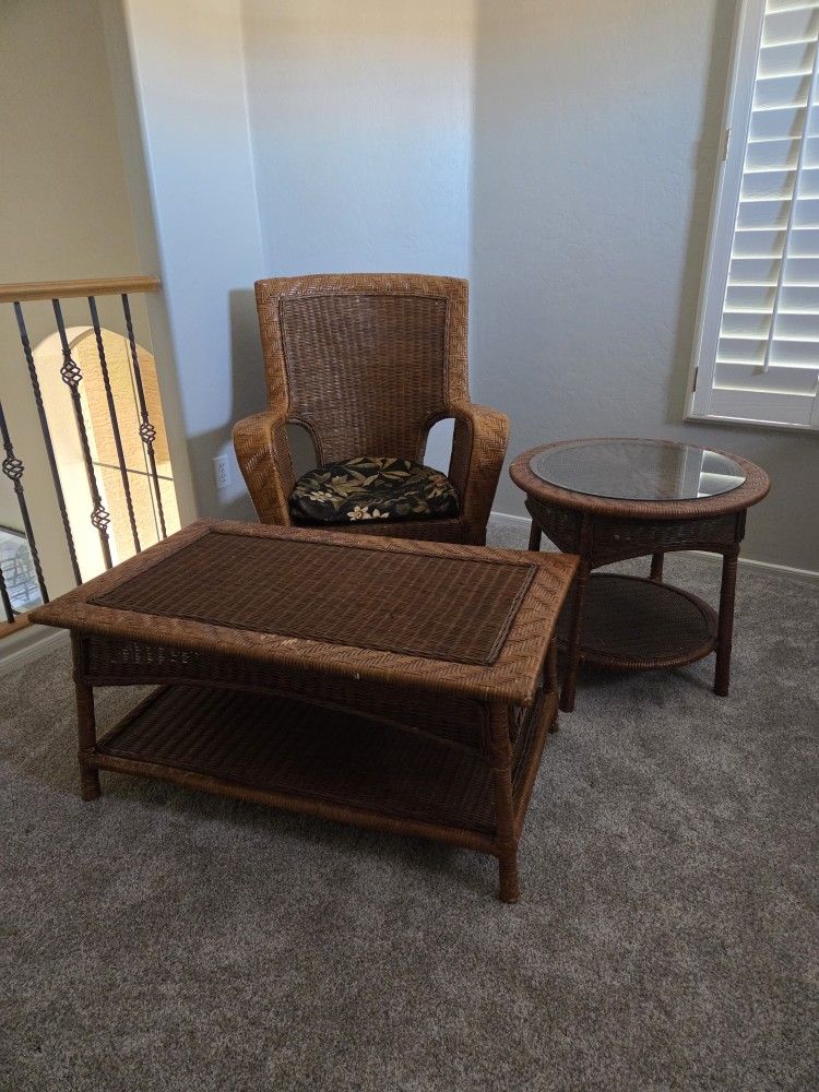 4 piece beautiful wicker furniture, includes 2 end table with glass tops, coffee size table and nice large chair....all in great condition Moving must sell....best offer