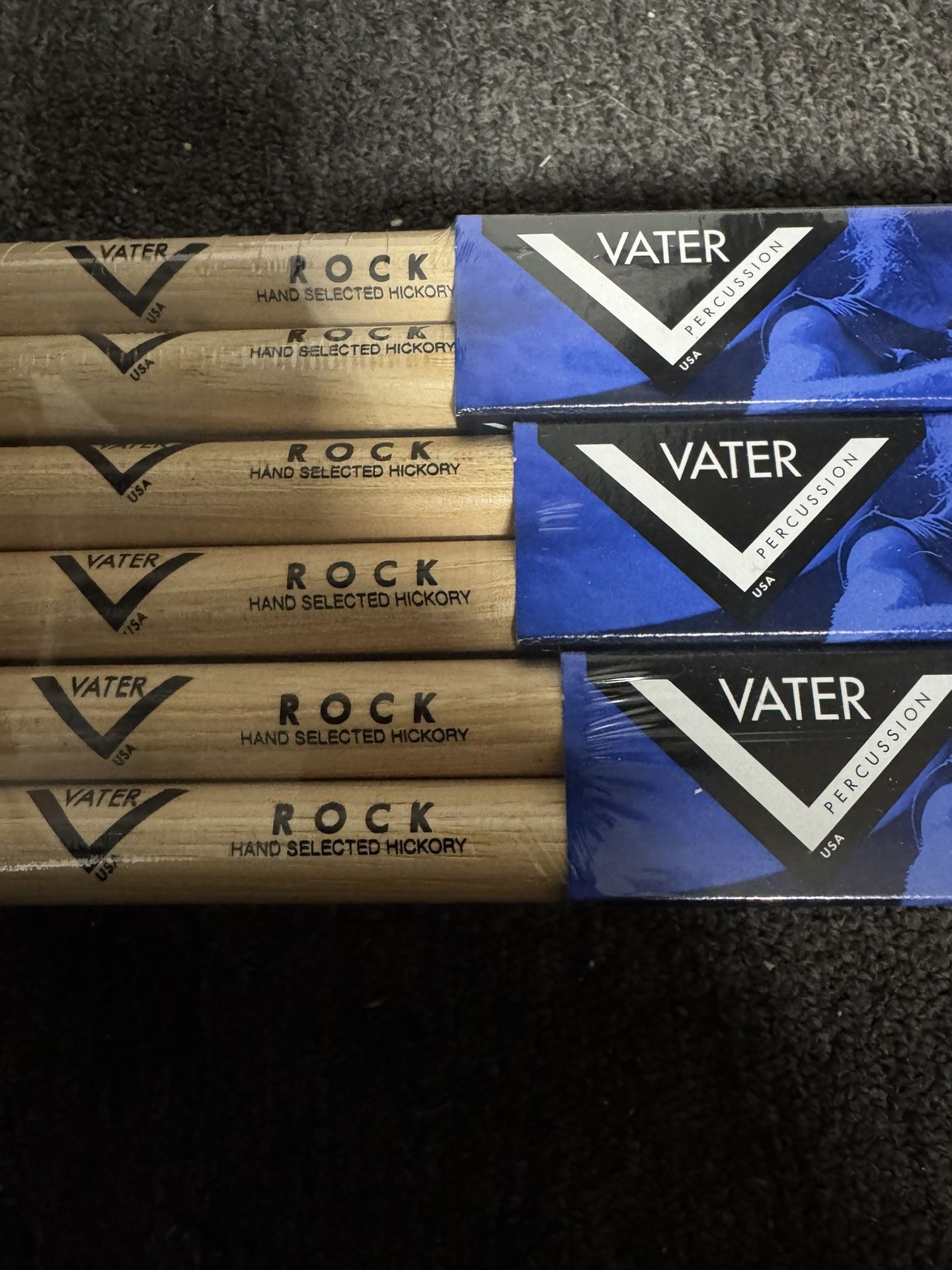 Unopened brand new Vater Rock Hickory drum sticks. This is half the price you would pay in a store. 12 pairs