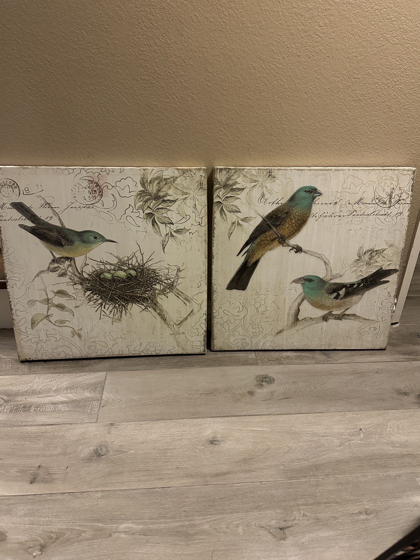 Each one measures 24”x24” Selling this bird pair for $20. It has some beautiful silver accents when light hits it at a certain angle. Serious buyers only. Moving need gone. I am downsizing. See other listings for home decor. In mint condition.