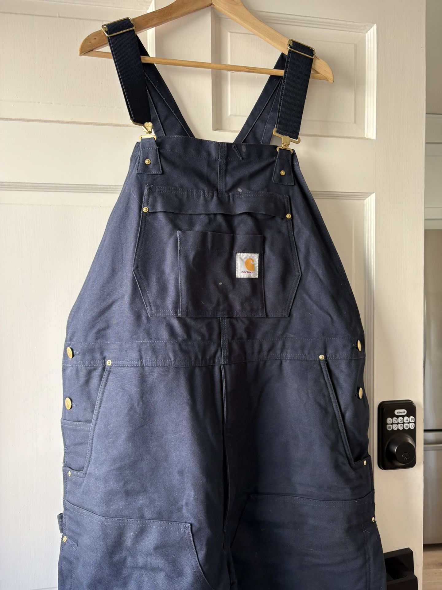 Features 12-ounce, 100% ringspun cotton duck Quilted lining for easy on and off; Arctic-weight polyester insulation for ultimate warmth Carhartt strong triple-stitched main seams Cordura®-reinforced kick panels add durability Two-way front zipper with storm flap Ankle-to-thigh leg zippers with storm flaps Knee pad compatible Zip pockets Cargo and back dungaree pockets Replaces R38 Model No. OR5470-M Country of Origin: Imported Used twice $55.00 Call or text (619) nine nine zero - 7019